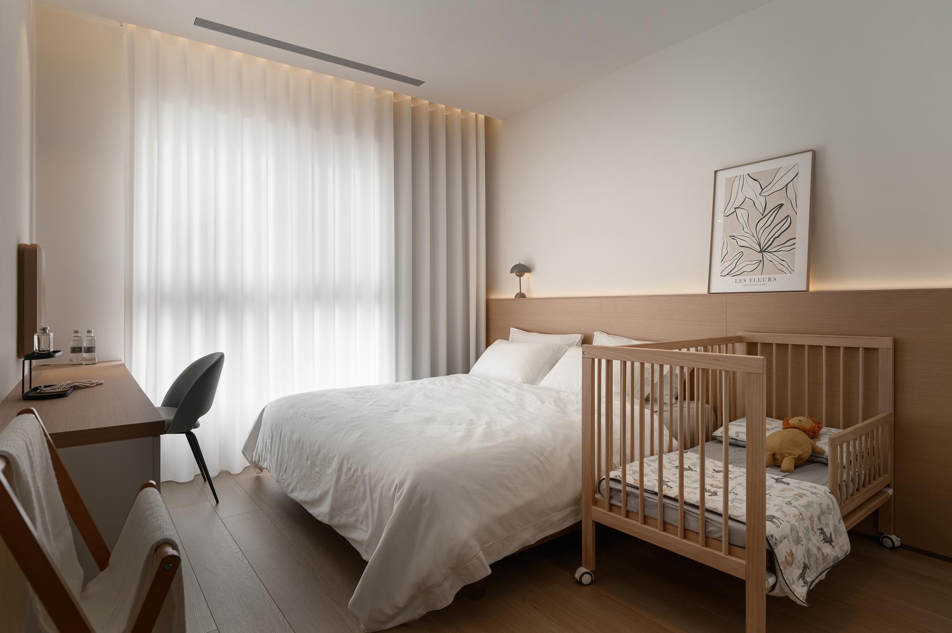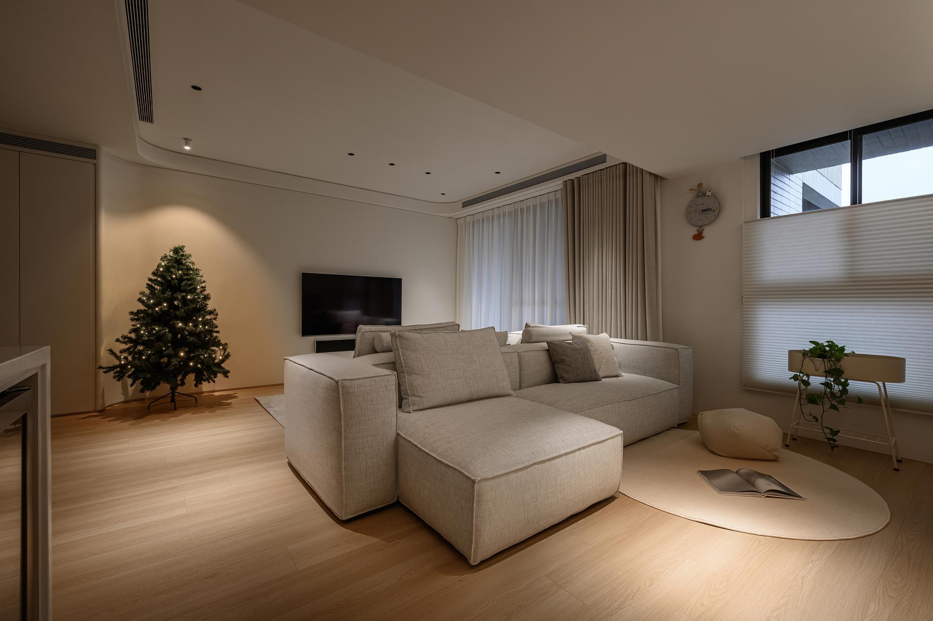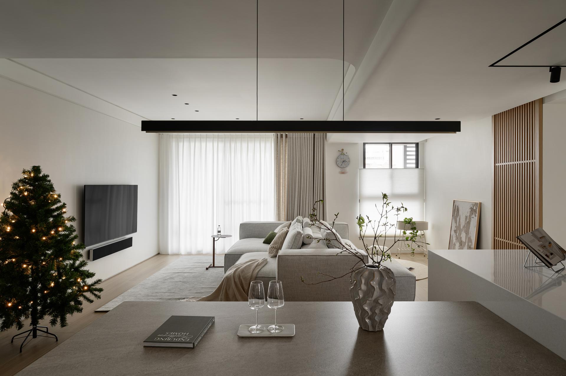 In response to the need for looking after children while cooking, the kitchen island serves as the central workstation, incorporating an oven, rice cooker, wine fridge, and a docking station for the robot vacuum cleaner. Kept the existing engineered stone countertop from the developer to maintain a consistent kitchen system. Cabinet doors are finished in a soft ivory tone, reflecting the homeowner’s preferences. From the entryway to the dining area, warm wood veneer defines the main feature wall, reinforcing spatial accents.