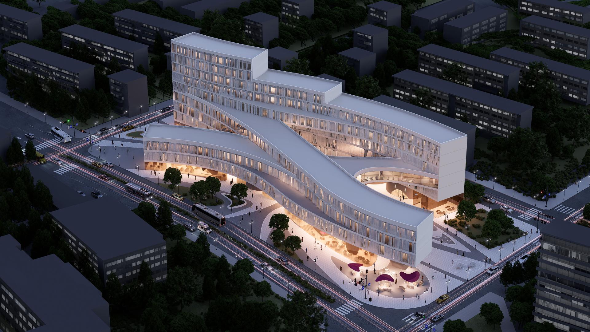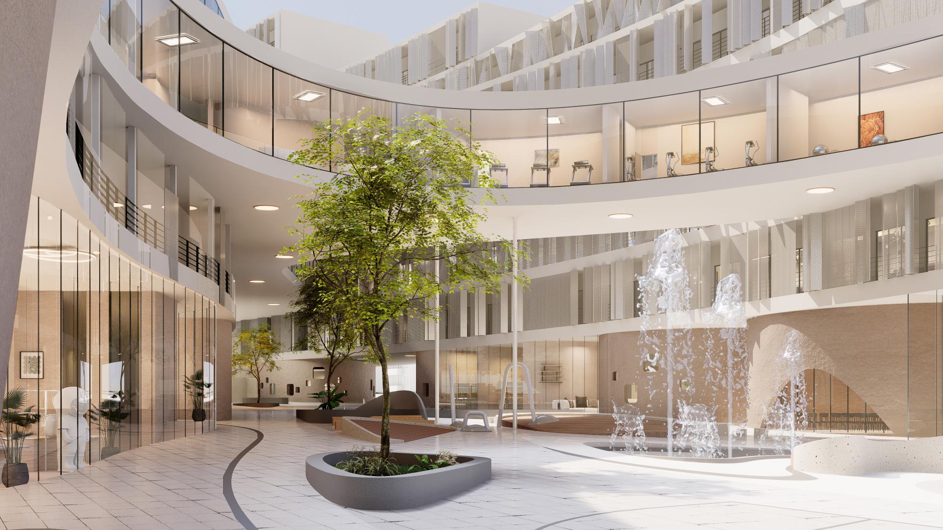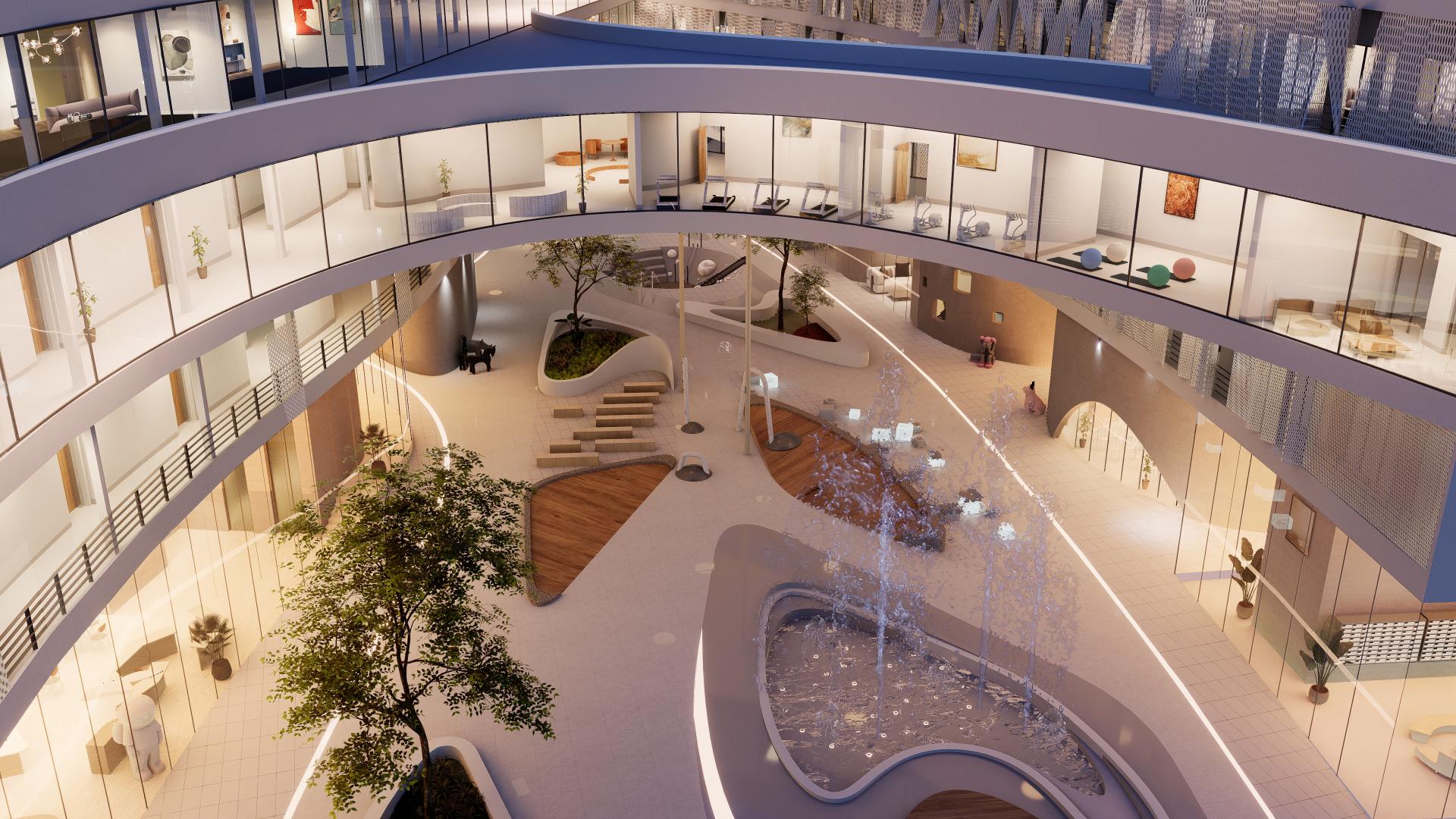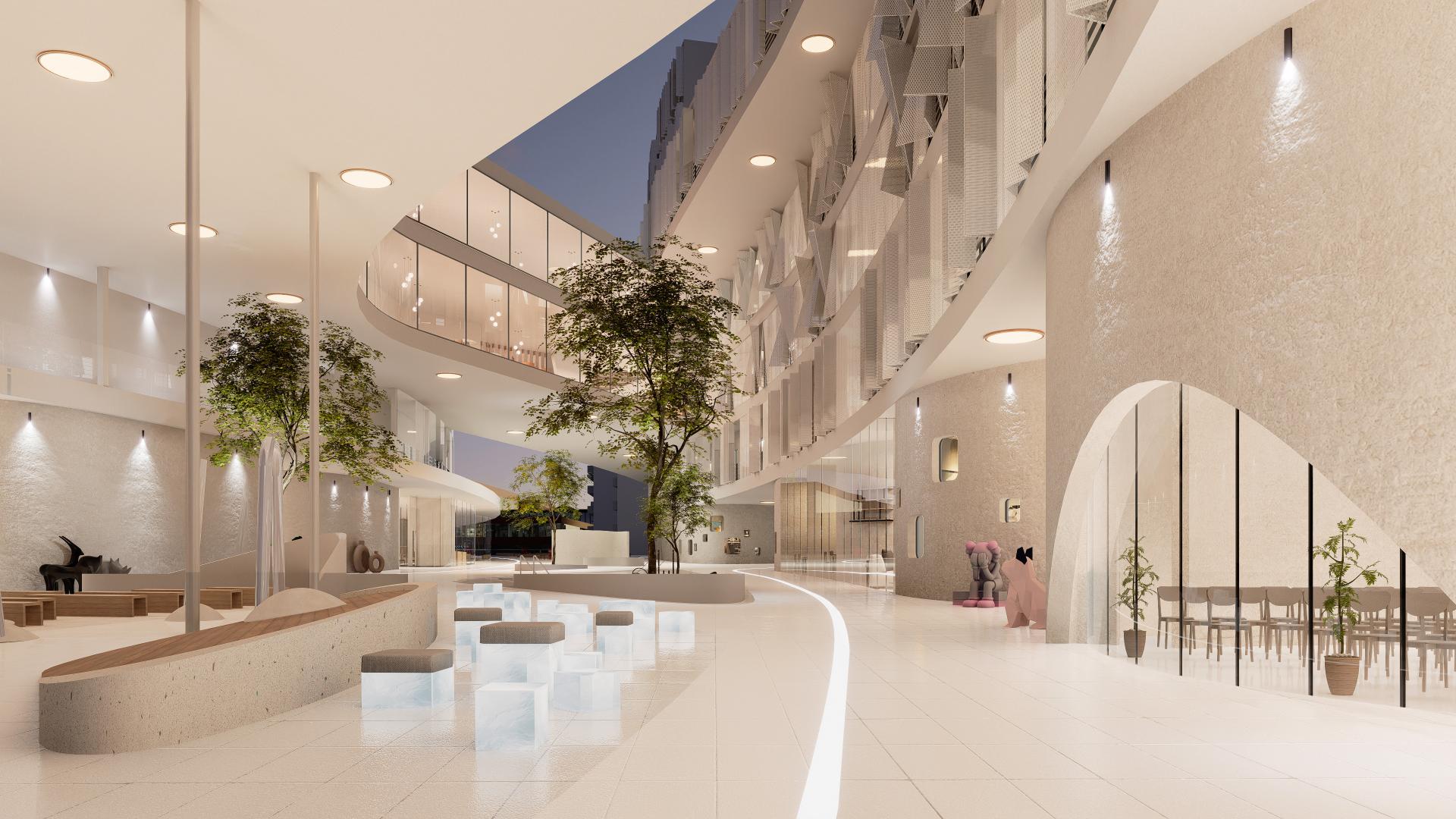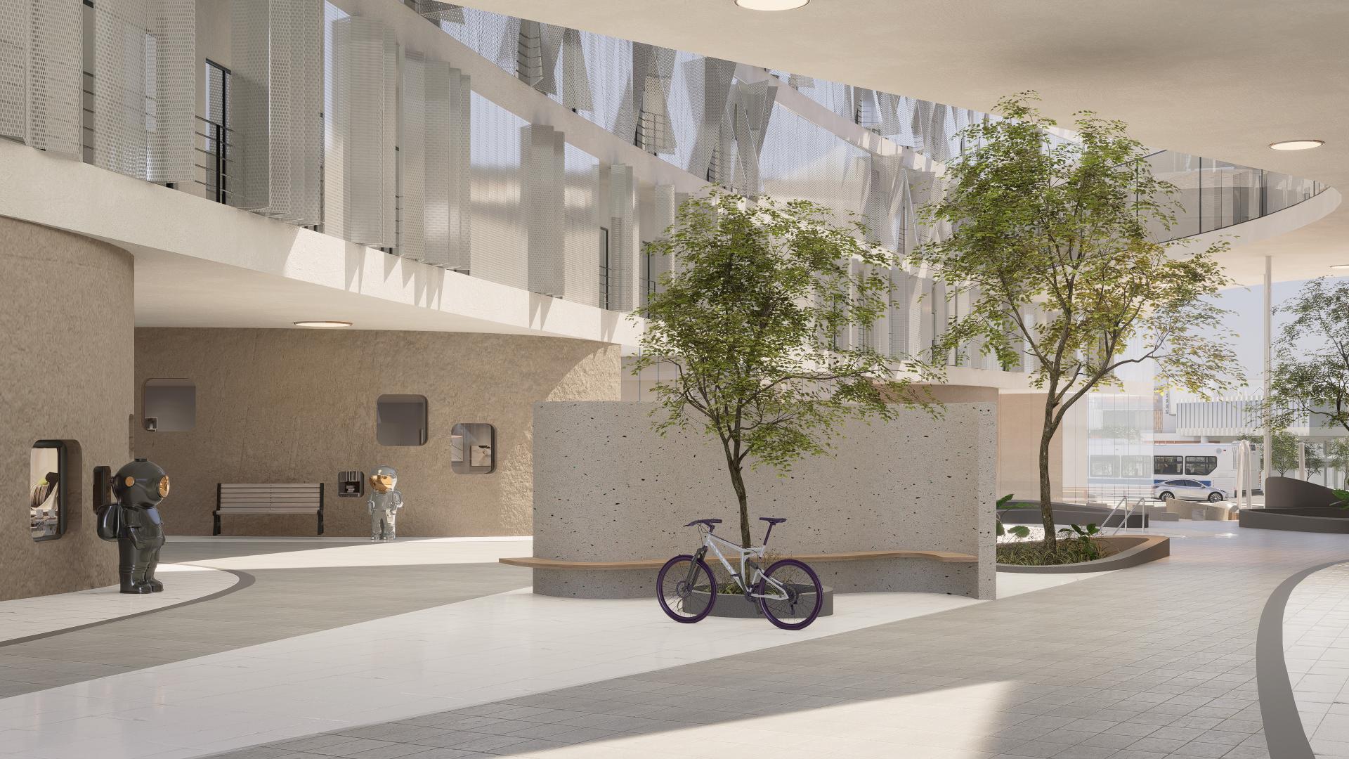 The community's layout is organized as follows: The first floor features rentable commercial spaces with curvilinear landscaping and playground systems. The 2nd to 4th floors accommodate rentable offices, amenity spaces for residents, and units with independent rooms. The 5th to 9th floors consist of typical residential units. The more flexible commercial spaces incorporate load-bearing concrete components and glass curtains, resulting in a column-free structure. Conversely, the upper floors - residential units, utilize a steel structure due to more stringent regulations. A pocket landscape system is integrated at ground level, offering a decentralized, diverse, and multi-purpose playground that caters to people of all ages, from children to the elderly.
