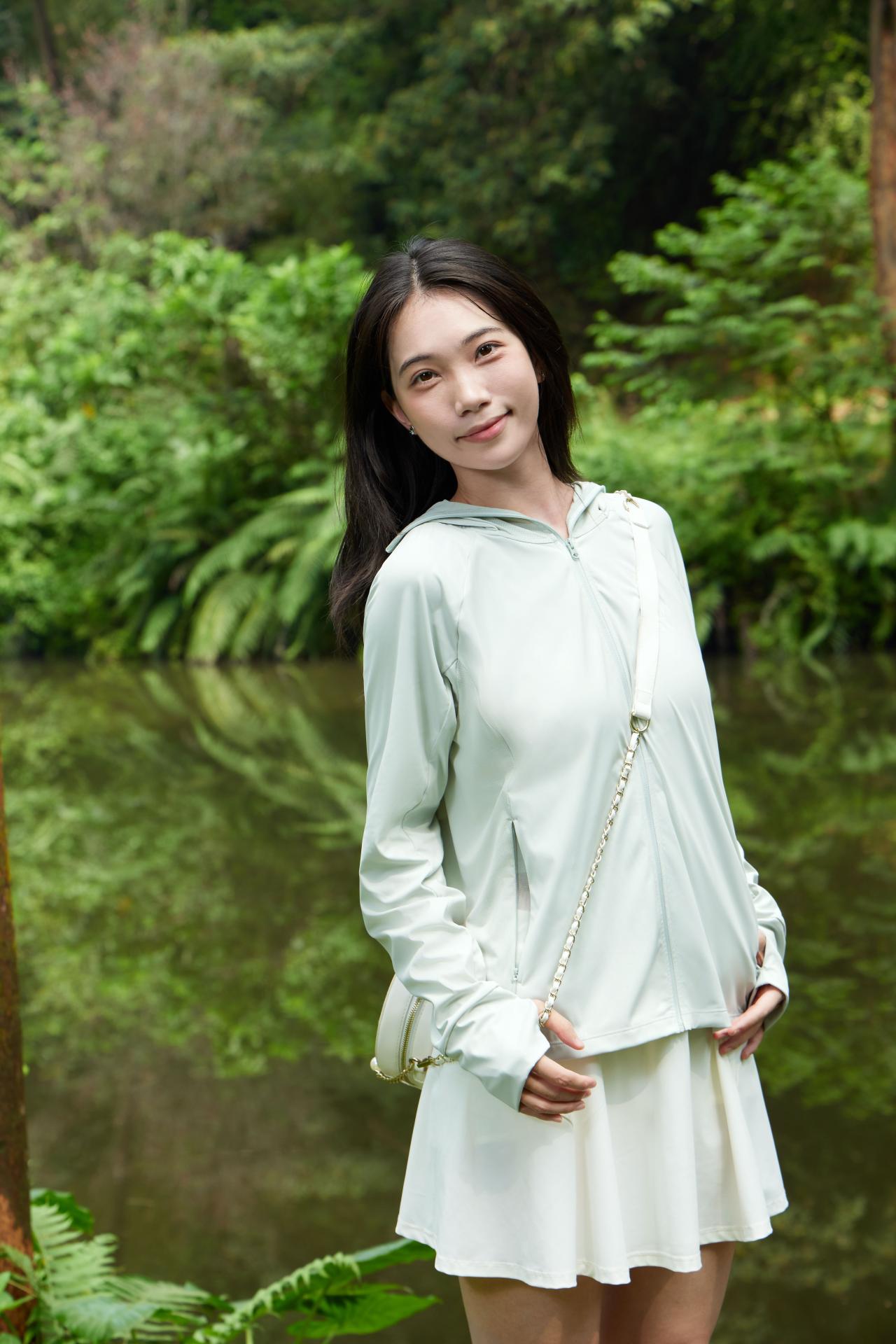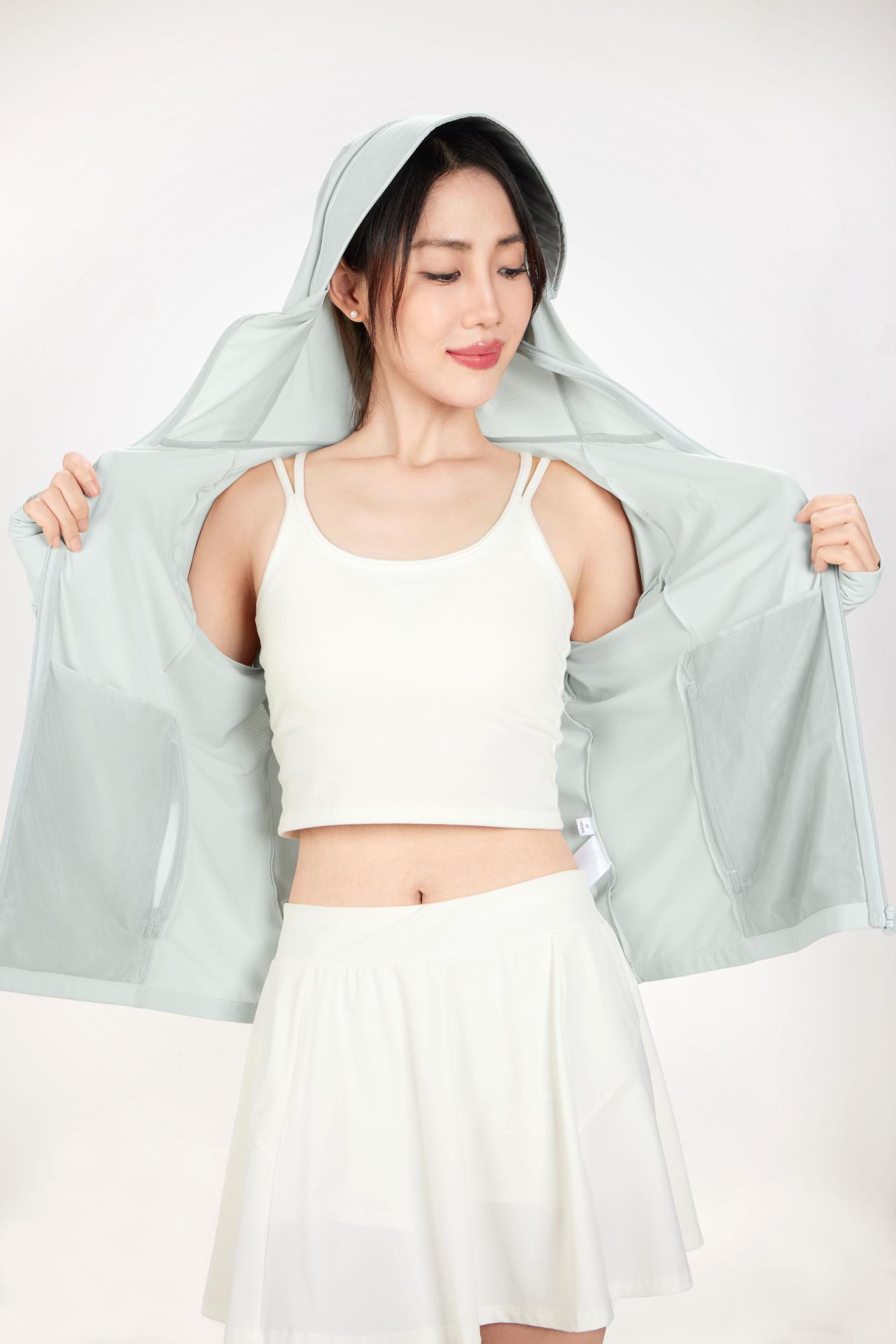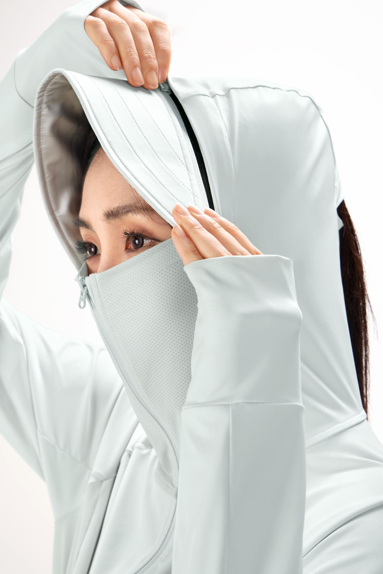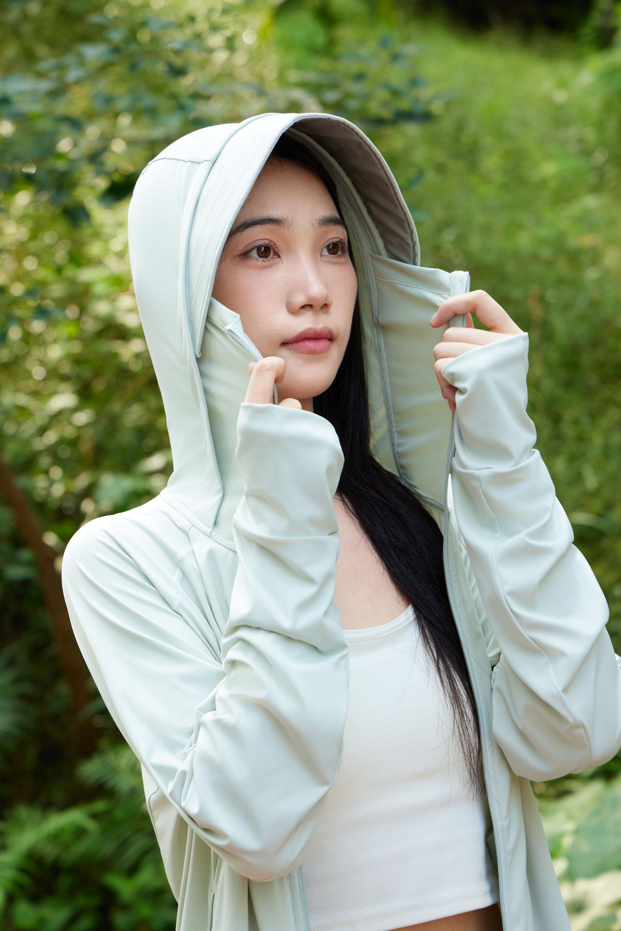 This sun-protective apparel, Camellia, embodies the essence of the camellia blossom—both in its advanced technology and aesthetics. At the core of its performance is the “Camellia Sun Protection” technology, which employs a patented extraction method to encapsulate camellia phenol—a potent natural compound celebrated for its antioxidant and brightening benefits—directly into the fibers. Enhanced by “Molecular Nest” technology, this formulation achieves exceptional wash durability, ensuring a sustained release of active ingredients for prolonged skin nourishment. Camellia phenol molecules synergize with UV absorbers to create a dual-defense system: shielding the skin from external UV radiation while simultaneously delivering internal care—fulfilling the holistic principle of skin wellness. Taking its protection a step further, the design leverages inherent functional yarn technology—embedding UPF 500+ performance and 3A-grade antibacterial properties directly into the fibers during the spinning stage, eliminating the need for after-treatments like coatings or chemical finishes. This approach not only eliminates the safety risks and environmental burden associated with conventional chemical additives but also guarantees exceptional skin-friendliness, enduring performance, and superior breathability. Moreover, a tripartite synergistic system forms a comprehensive thermal management solution: UPF 500+ effectively blocks harmful ultraviolet radiation; a heat-shielding rate of ≥30% reflects infrared thermal energy; and cooling fibers actively wick heat away from the skin. Together, this “Block–Reflect–Dissipate” mechanism creates a dynamic balance between sun protection,cooling, and all-day comfort.