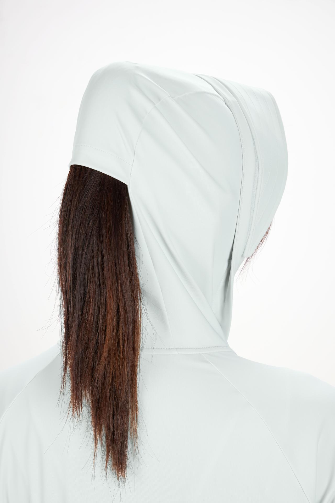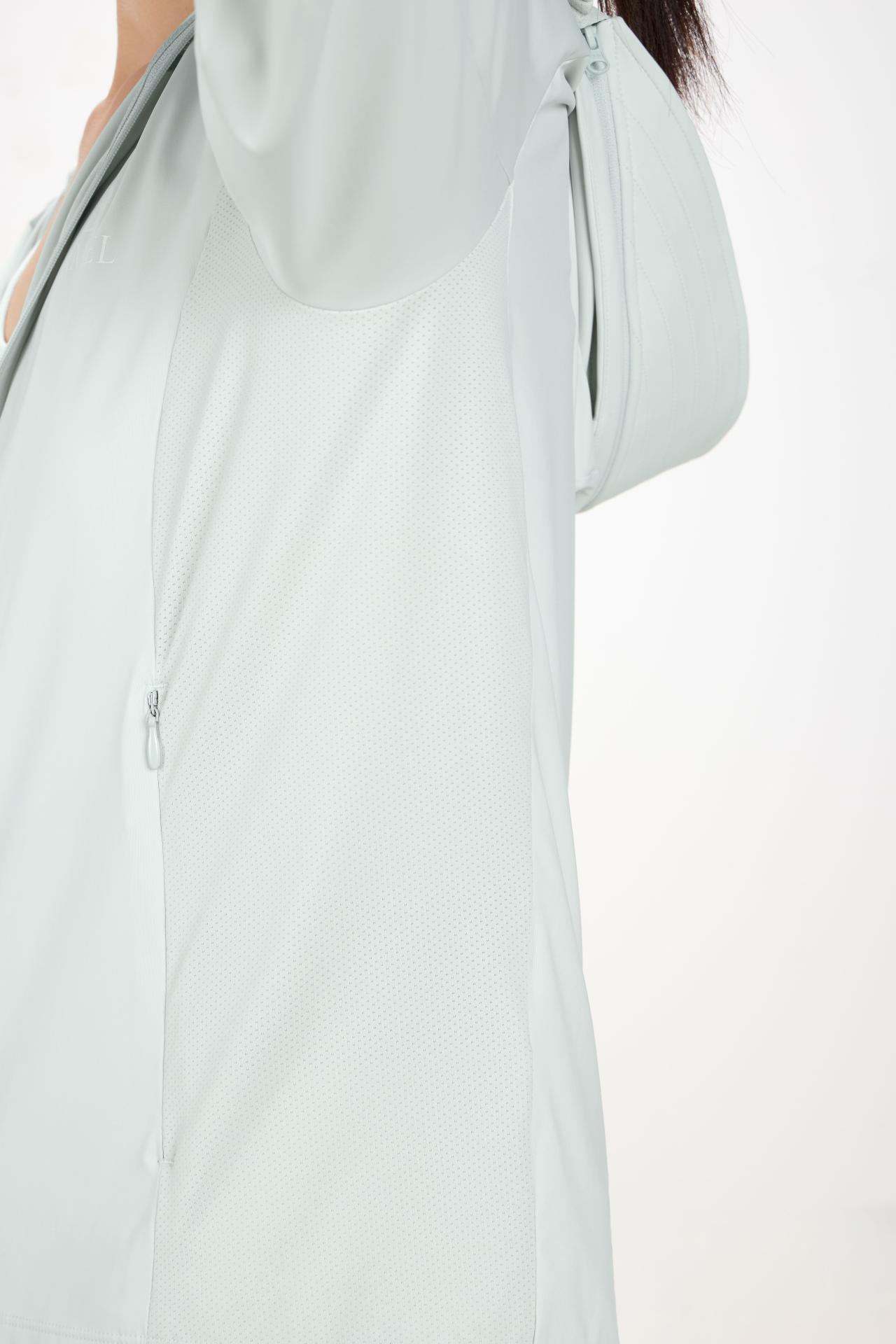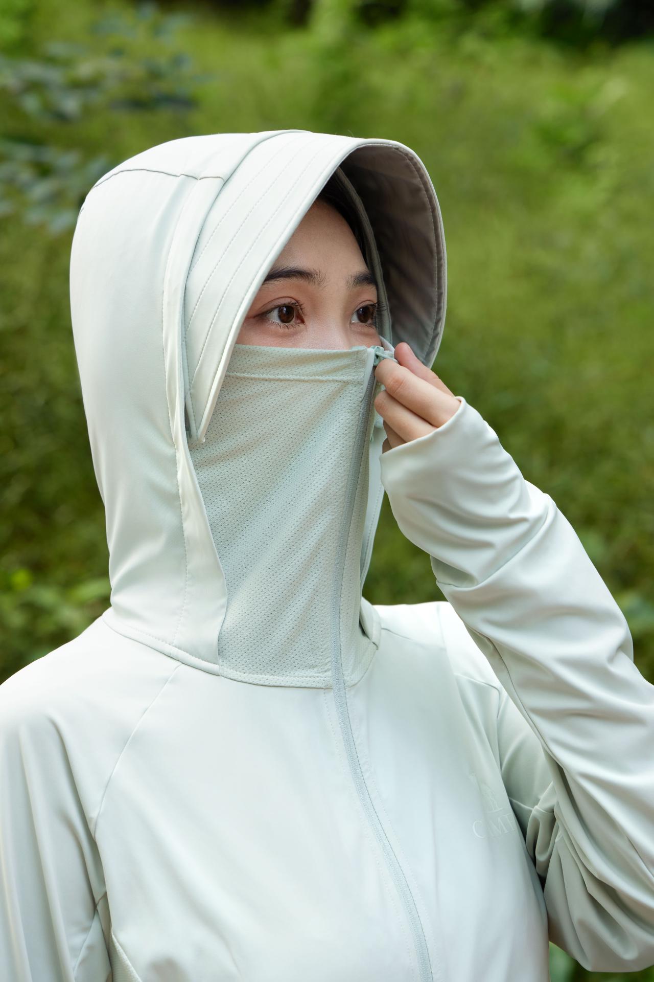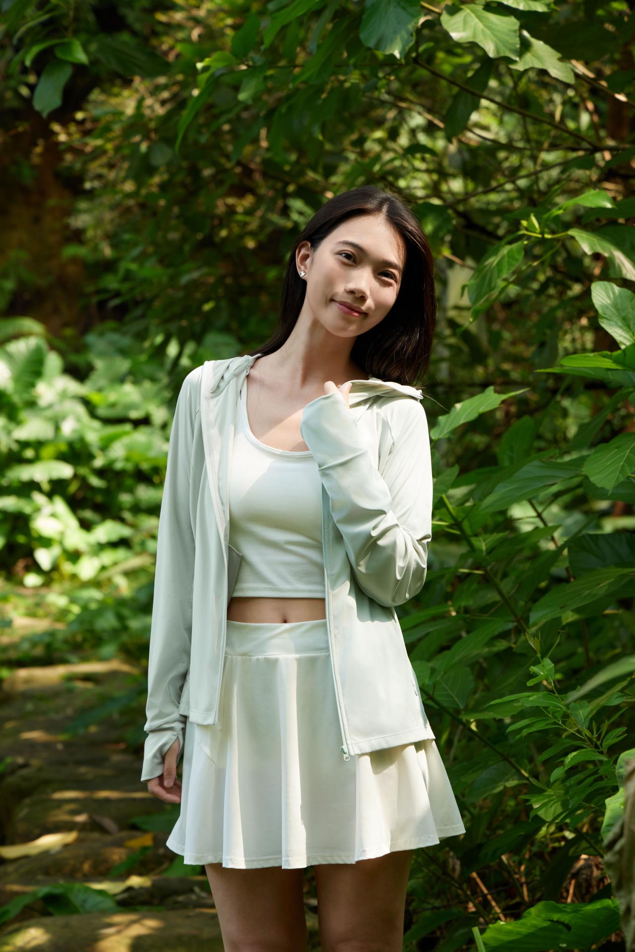 This sun-protective apparel, Camellia, embodies the essence of the camellia blossom—both in its advanced technology and aesthetics. At the core of its performance is the “Camellia Sun Protection” technology, which employs a patented extraction method to encapsulate camellia phenol—a potent natural compound celebrated for its antioxidant and brightening benefits—directly into the fibers. Enhanced by “Molecular Nest” technology, this formulation achieves exceptional wash durability, ensuring a sustained release of active ingredients for prolonged skin nourishment. Camellia phenol molecules synergize with UV absorbers to create a dual-defense system: shielding the skin from external UV radiation while simultaneously delivering internal care—fulfilling the holistic principle of skin wellness. Taking its protection a step further, the design leverages inherent functional yarn technology—embedding UPF 500+ performance and 3A-grade antibacterial properties directly into the fibers during the spinning stage, eliminating the need for after-treatments like coatings or chemical finishes. This approach not only eliminates the safety risks and environmental burden associated with conventional chemical additives but also guarantees exceptional skin-friendliness, enduring performance, and superior breathability. Moreover, a tripartite synergistic system forms a comprehensive thermal management solution: UPF 500+ effectively blocks harmful ultraviolet radiation; a heat-shielding rate of ≥30% reflects infrared thermal energy; and cooling fibers actively wick heat away from the skin. Together, this “Block–Reflect–Dissipate” mechanism creates a dynamic balance between sun protection,cooling, and all-day comfort.