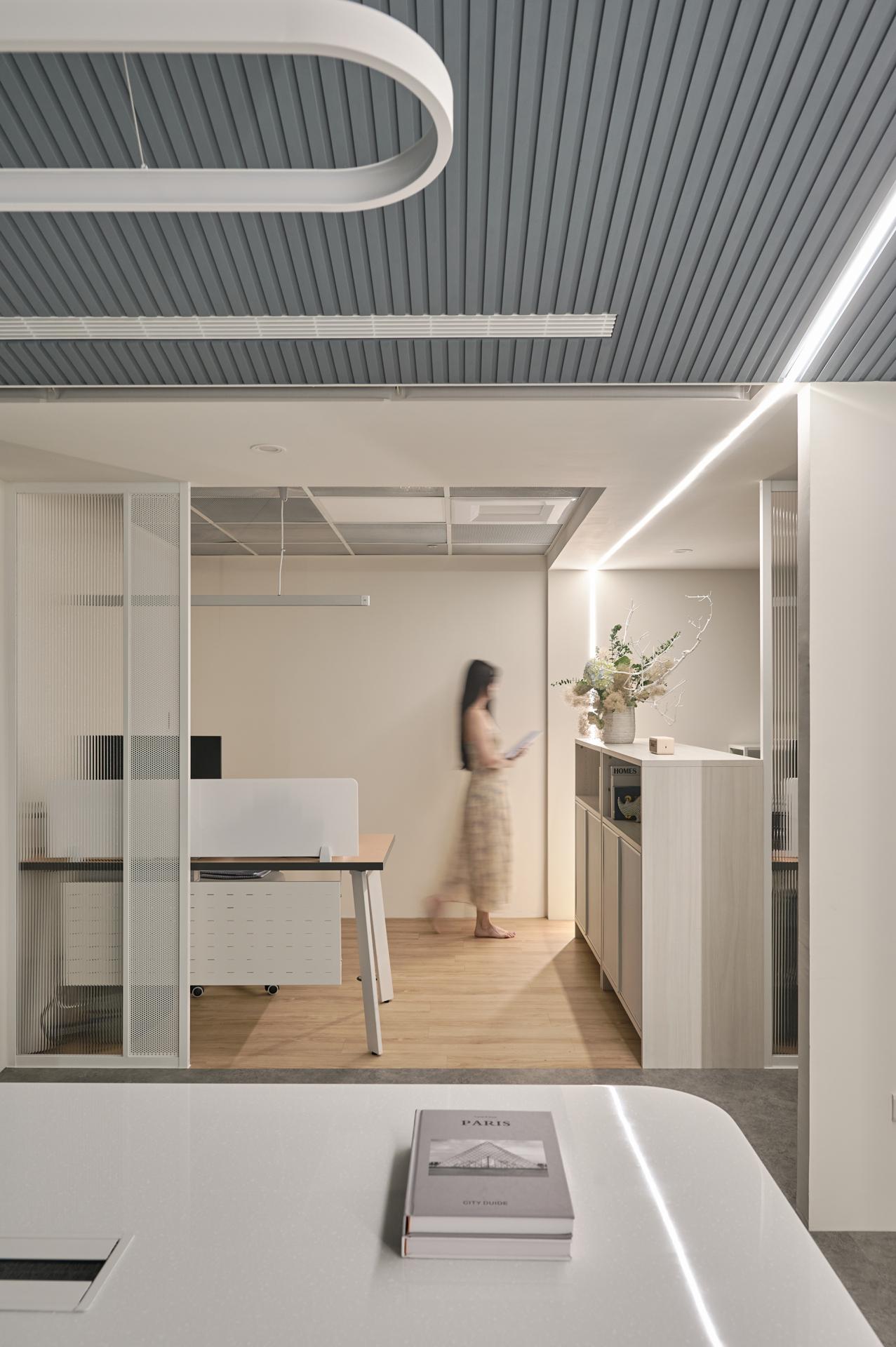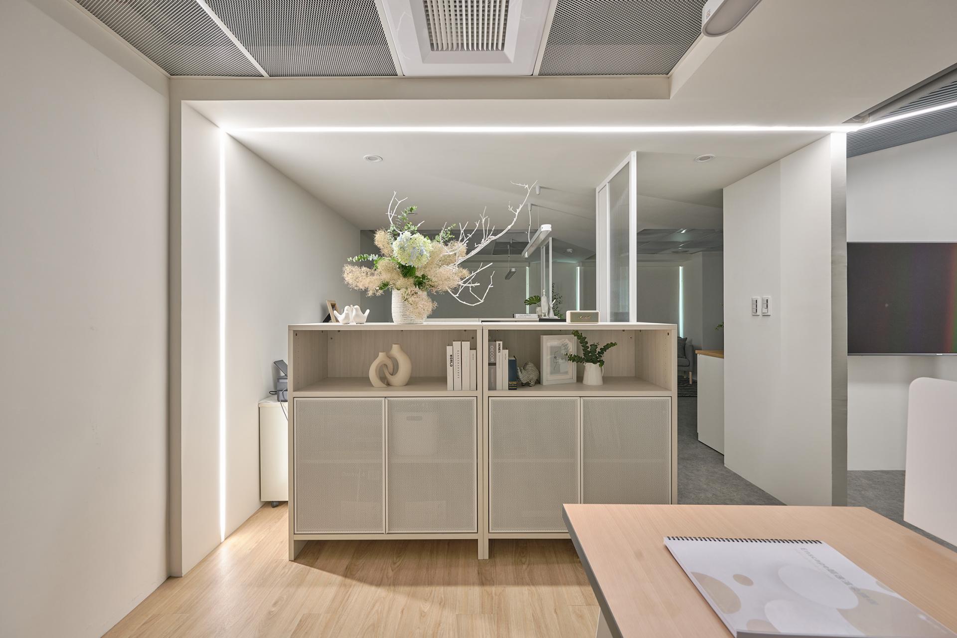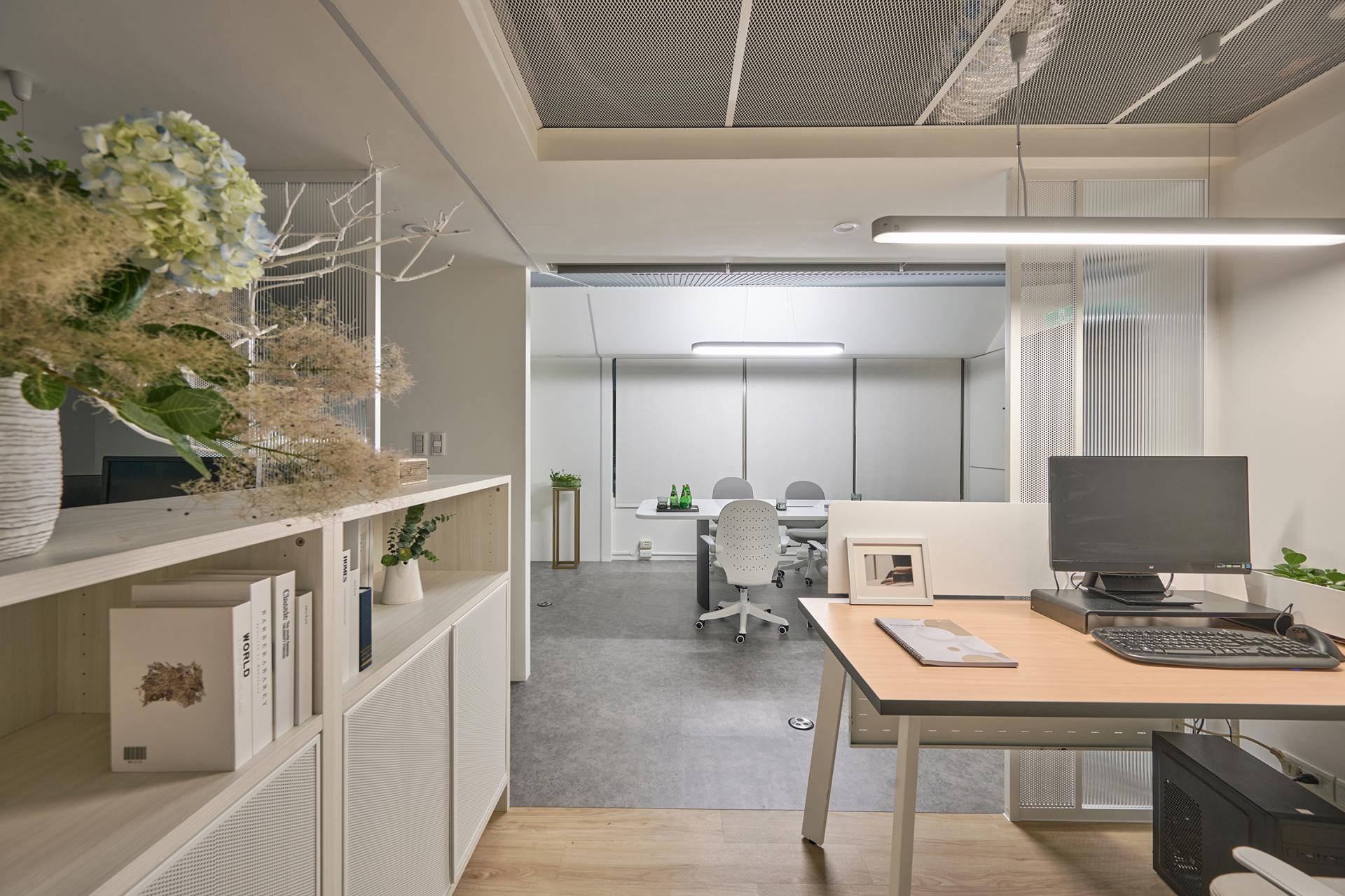 A central corridor anchors the spatial plan. On the left side sit three office zones; opposite them are the meeting room, lounge, and manager’s office. Placing the meeting room near the entrance supports course enrollment and provides convenient access for visitors. Equipped with a large screen and a long table, it can easily transition into a dedicated teaching space via roller blinds. The office area extends deeper into the plan, creating a progression from public to private. Each desk is paired with an aluminum-framed divider and two low cabinets to provide sufficient storage. Besides, the arrangement strategically shields workers from corridor movement without disrupting visibility, resulting in an open yet discreet workspace with layered privacy.