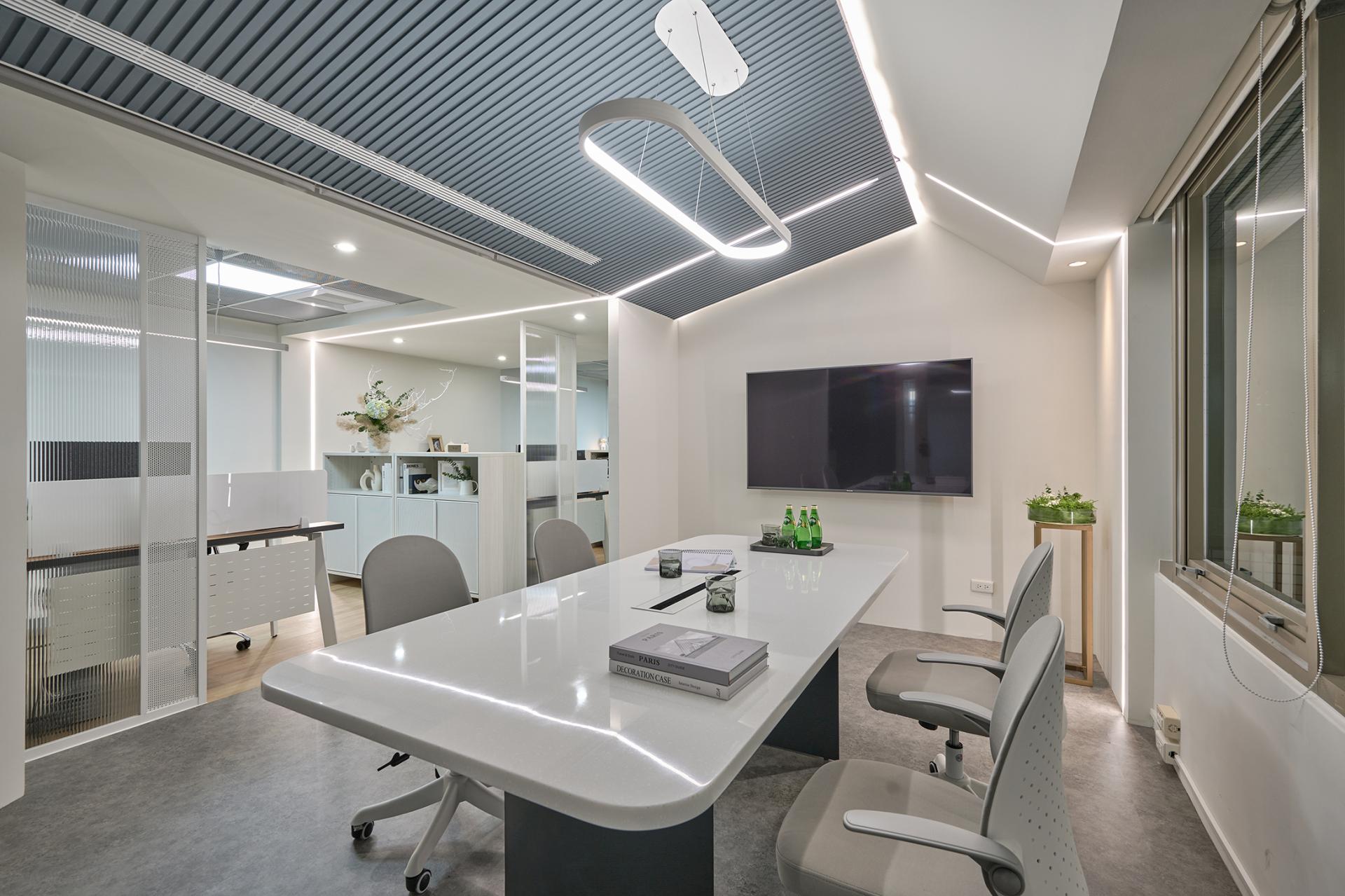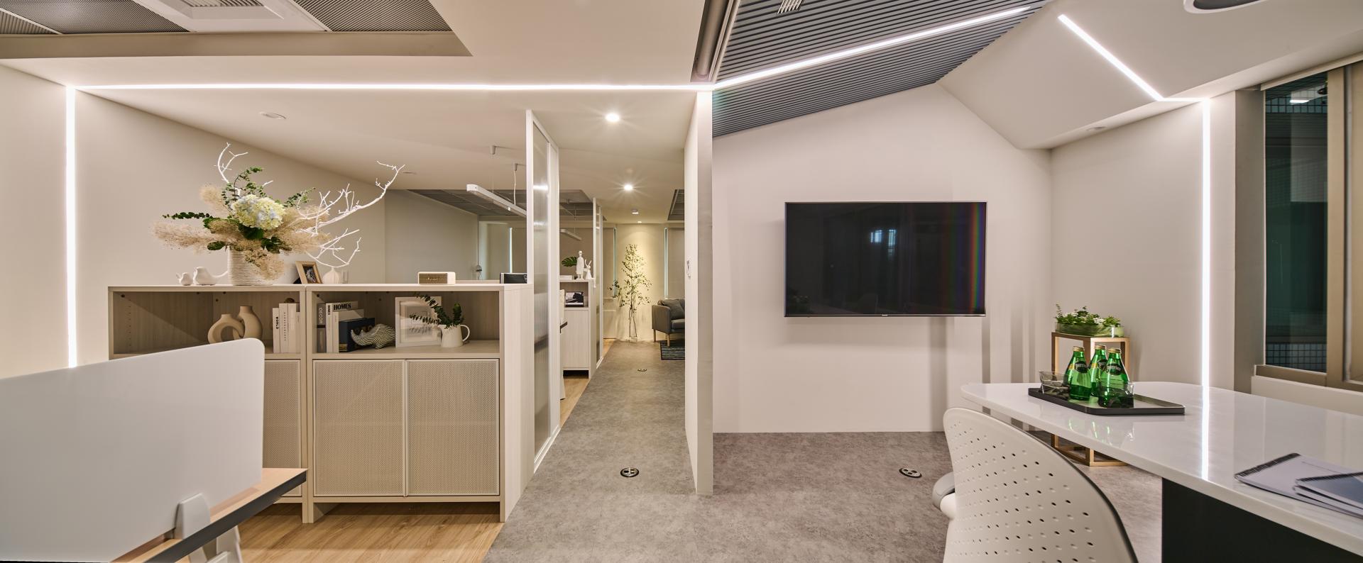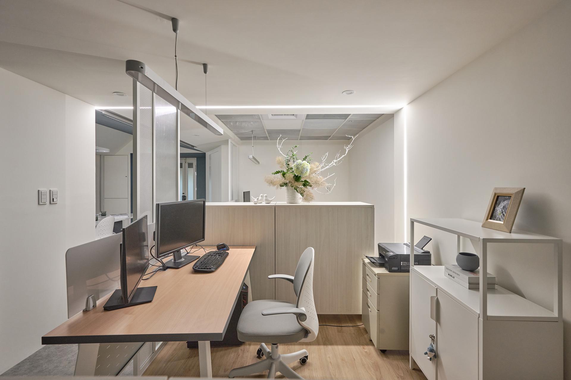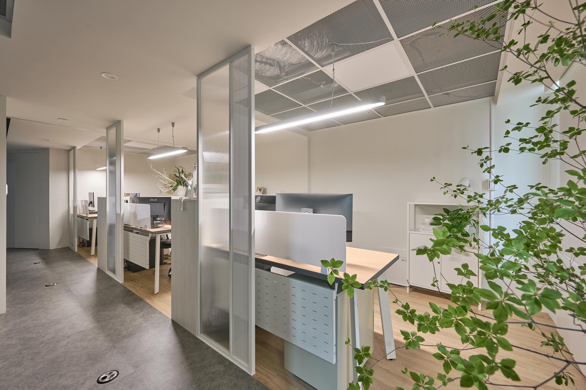 A central corridor anchors the spatial plan. On the left side sit three office zones; opposite them are the meeting room, lounge, and manager’s office. Placing the meeting room near the entrance supports course enrollment and provides convenient access for visitors. Equipped with a large screen and a long table, it can easily transition into a dedicated teaching space via roller blinds. The office area extends deeper into the plan, creating a progression from public to private. Each desk is paired with an aluminum-framed divider and two low cabinets to provide sufficient storage. Besides, the arrangement strategically shields workers from corridor movement without disrupting visibility, resulting in an open yet discreet workspace with layered privacy.