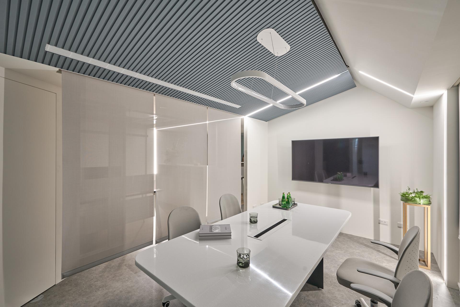 A shoe-changing vestibule marks the entrance area, artfully framed in blue to delineate interior and exterior spaces. The meeting room’s sloped ceiling extends upward by blue structural lines, simulating the silhouette of a house. Linear lighting embedded along the slope emphasizes this gesture. In the office and lounge, a warm-white expanded metal ceiling introduces a sense of openness and airiness. Floor materials subtly guide the mood: gray stone-patterned tiles define the meeting room and corridor, echoing the simplicity of traditional indigo dyeing workshops and encouraging focus; the office area shifts to wood flooring with white furnishings, skillfully setting a calm, welcoming tone.