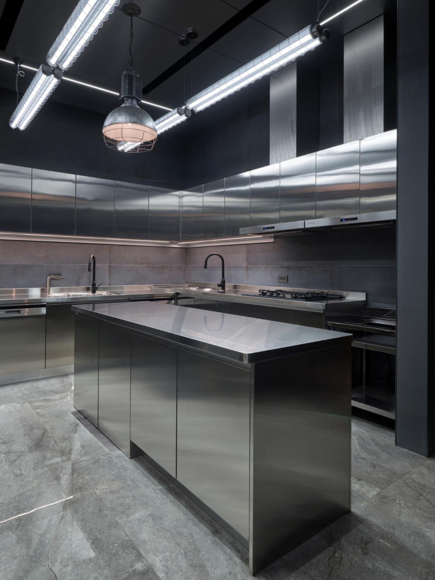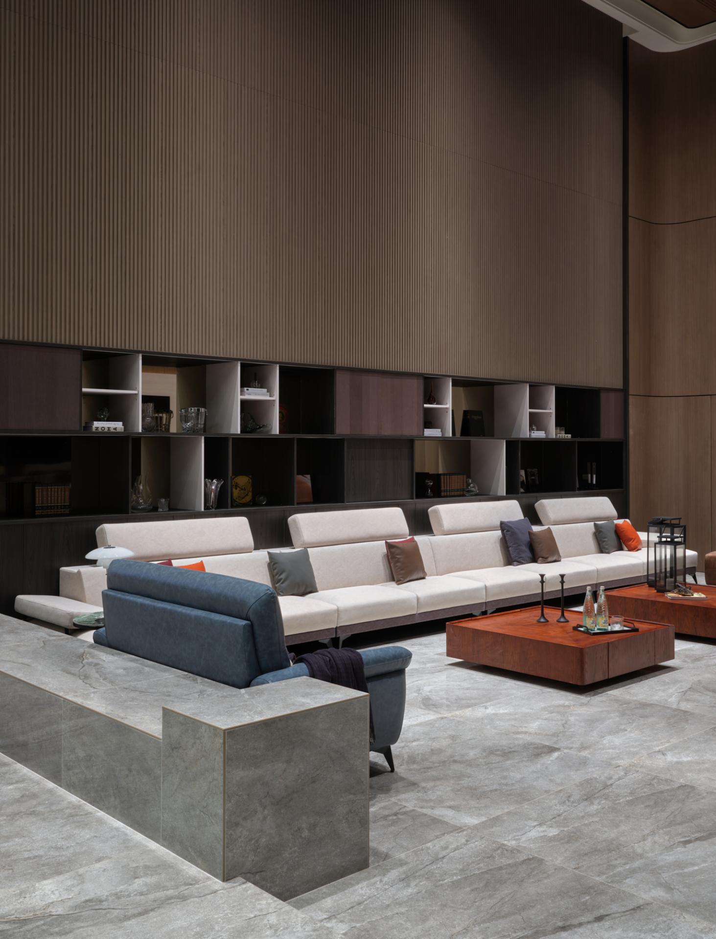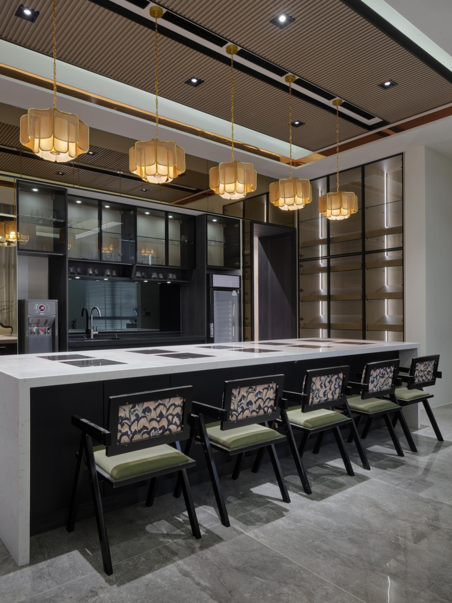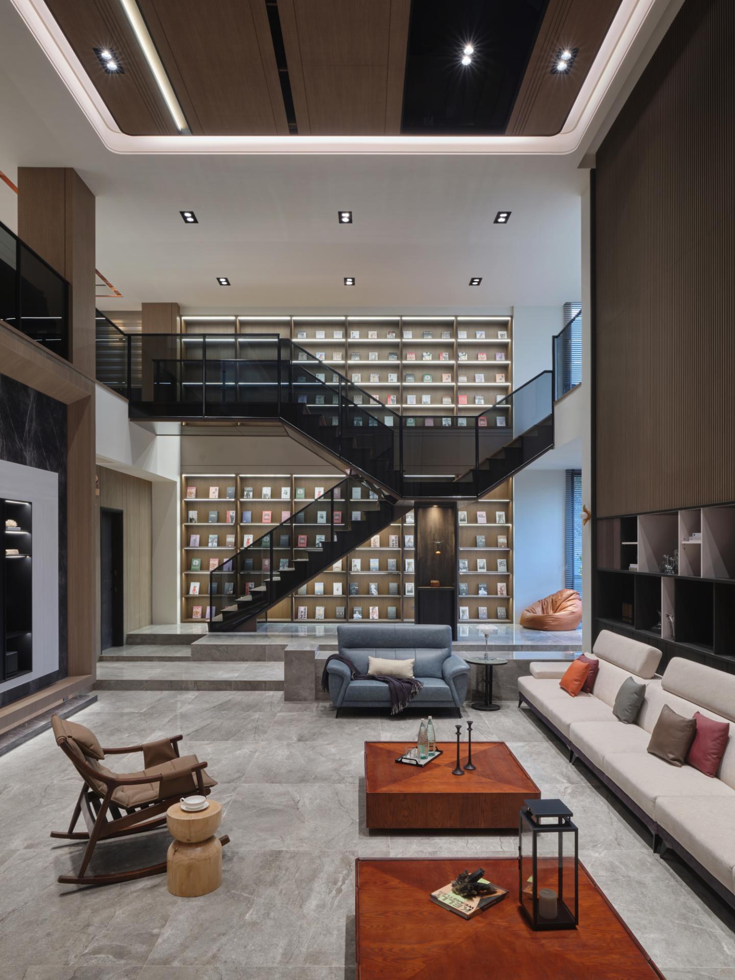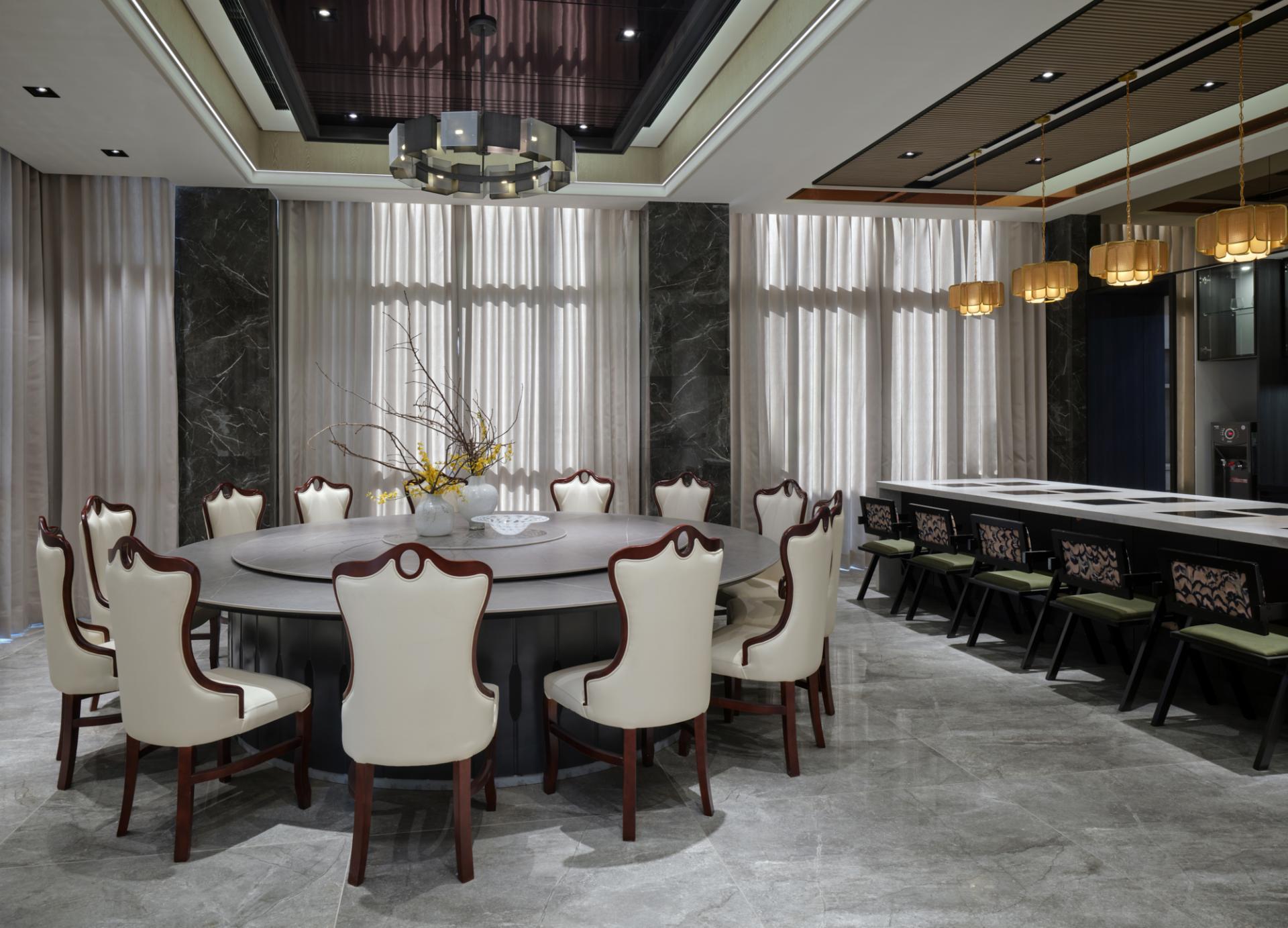 Adjacent to the living zone, the dining program is augmented by a bespoke circular table integrated with heating elements, specifically configured to support communal hotpot gatherings. This feature transcends functionality, acting as a social instrument that reinforces family cohesion through shared culinary rituals. A modern neoclassical logic is adopted, where symmetrical arrangements provide order to the expansive volume. Locally processed stone and refined metal lattices are employed to reinterpret historical motifs, translating the family's industrious background into tangible material textures. Fourteen rooms are distributed across five levels, organized to balance collective interaction with individual autonomy, ensuring the residence functions cohesively for the multi-generational household.