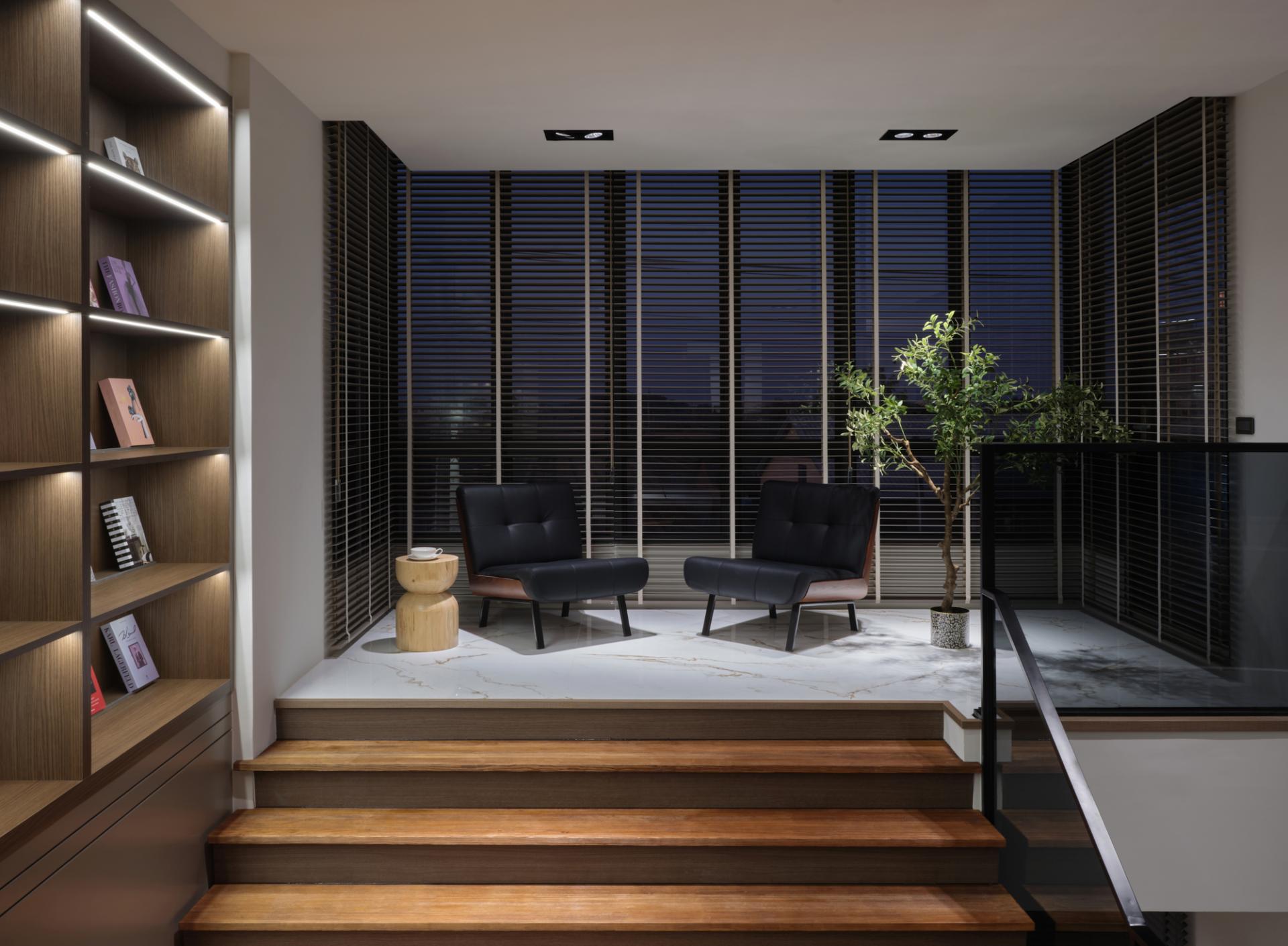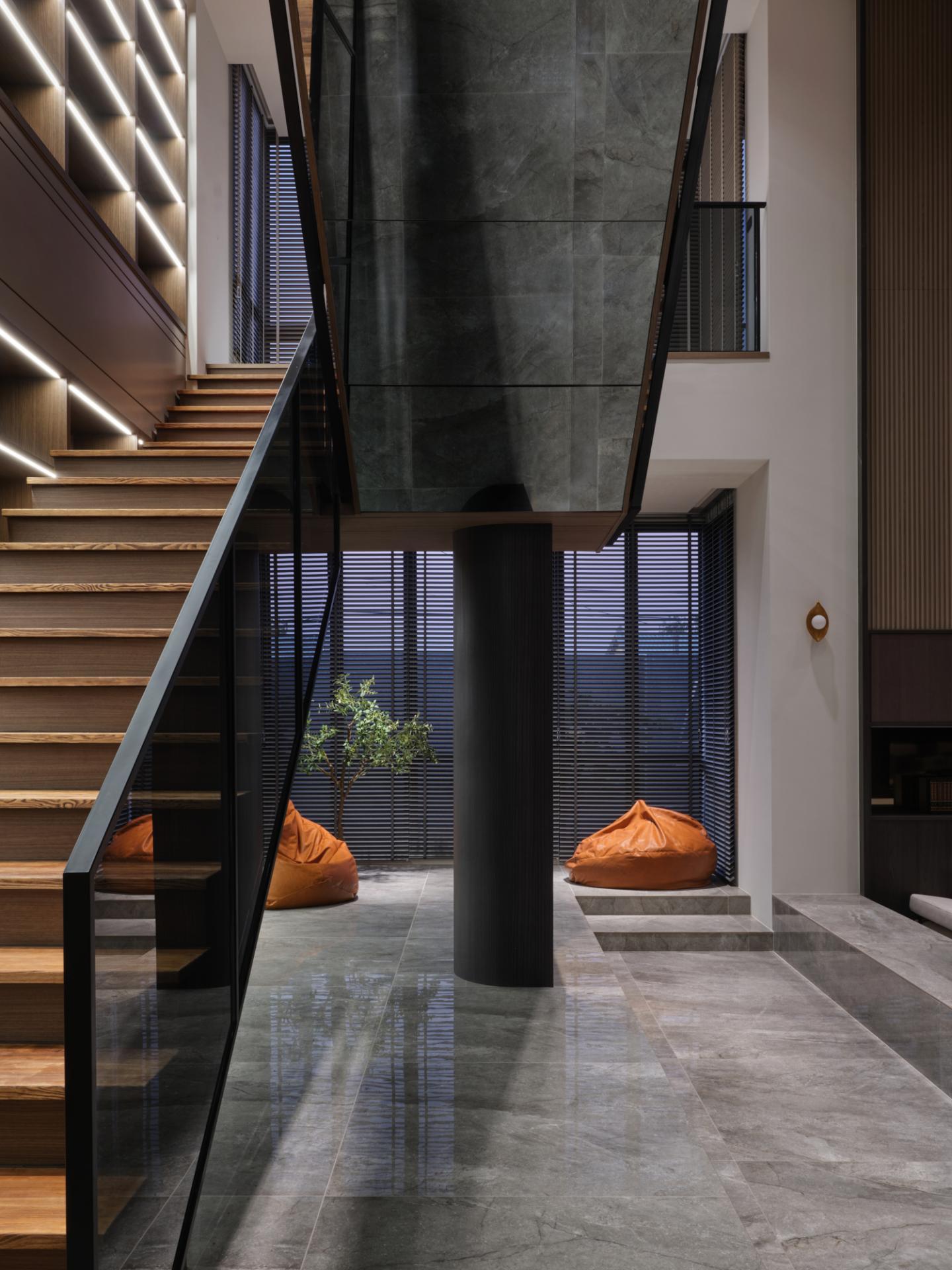 Upon entry, a monumental screen of natural stone serves as a visual anchor, establishing a threshold that separates the external environment from the domestic realm before the circulation splits into a T-shaped layout. This configuration directs movement toward shared spaces while preserving privacy for individual quarters. In the main living area, a sunken floor configuration establishes a distinct structural rhythm, creating a sense of enclosure without utilizing physical partitions. This topographical shift maintains visual continuity with the public zones while grounding the seating area.