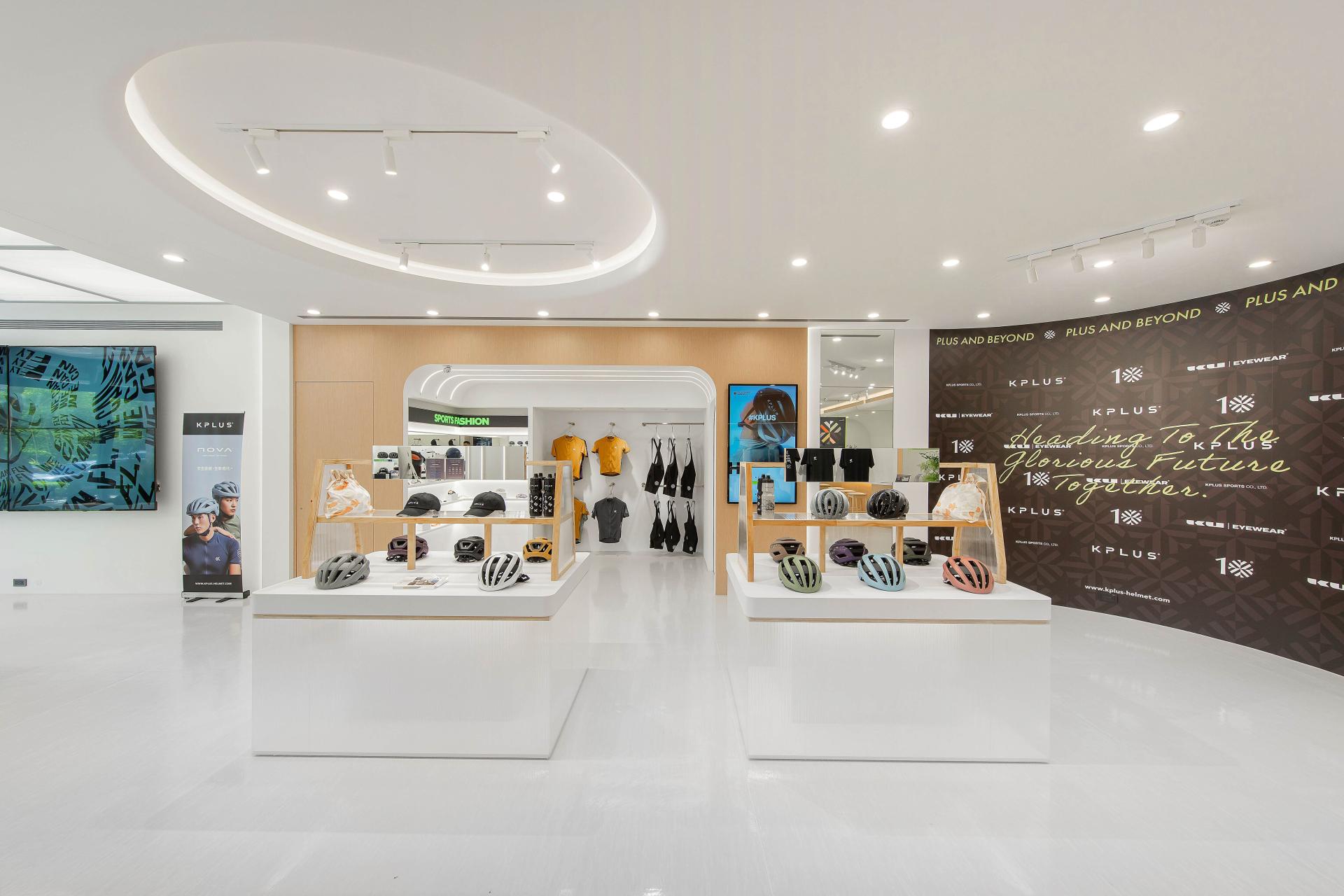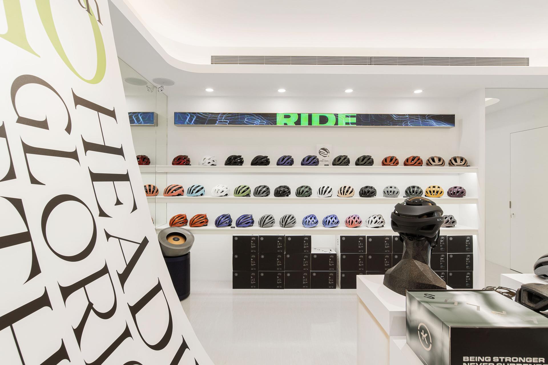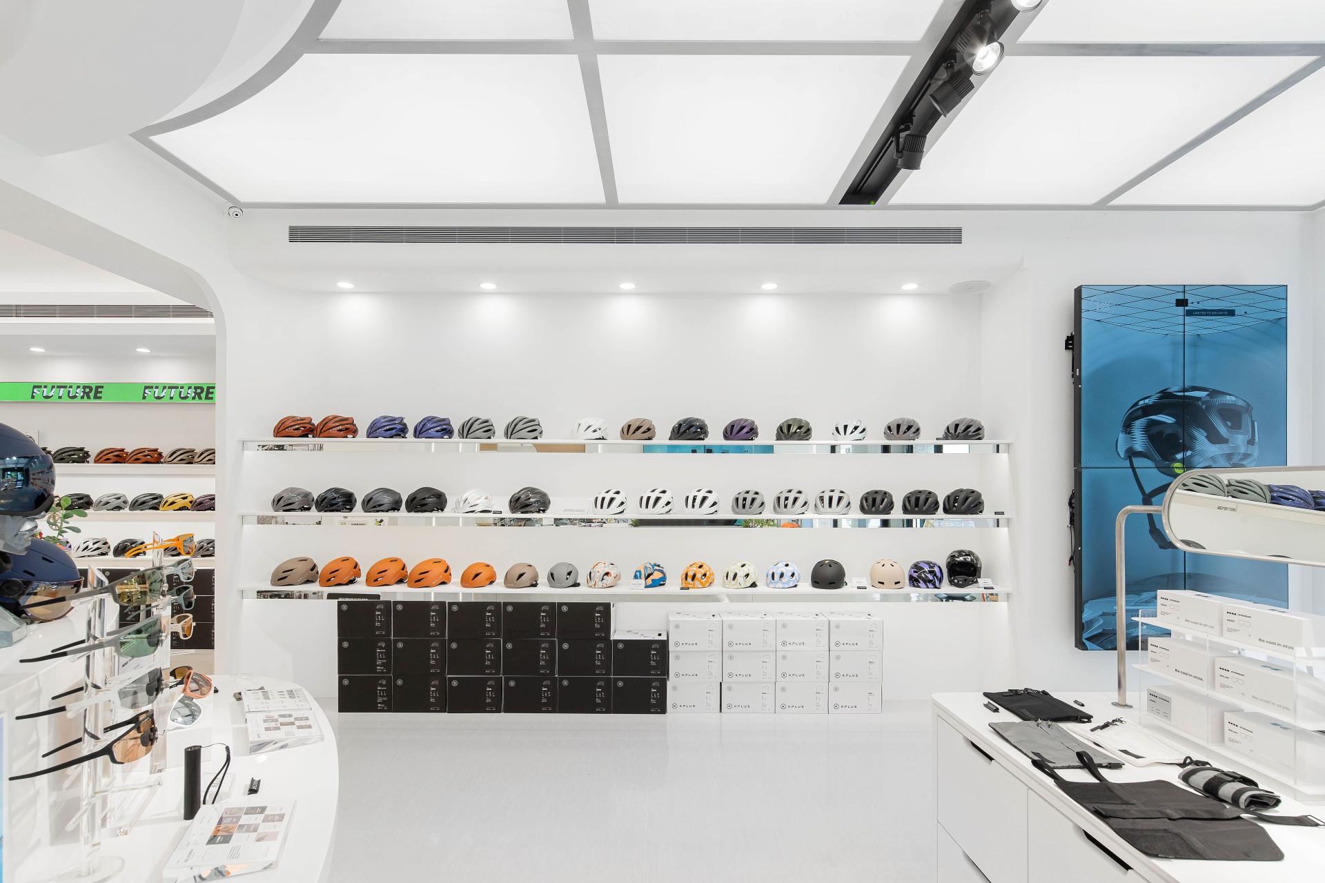 This is a retail store centered on bicycle helmets, showcasing unparalleled technological aesthetics through a modern and minimalist design language. The bright white color scheme sets a clean and transparent tone, creating an atmosphere that feels like stepping into the future. Large glass windows bring in natural light, highlighting the unique textures and details of each product in the interplay of light and shadow.