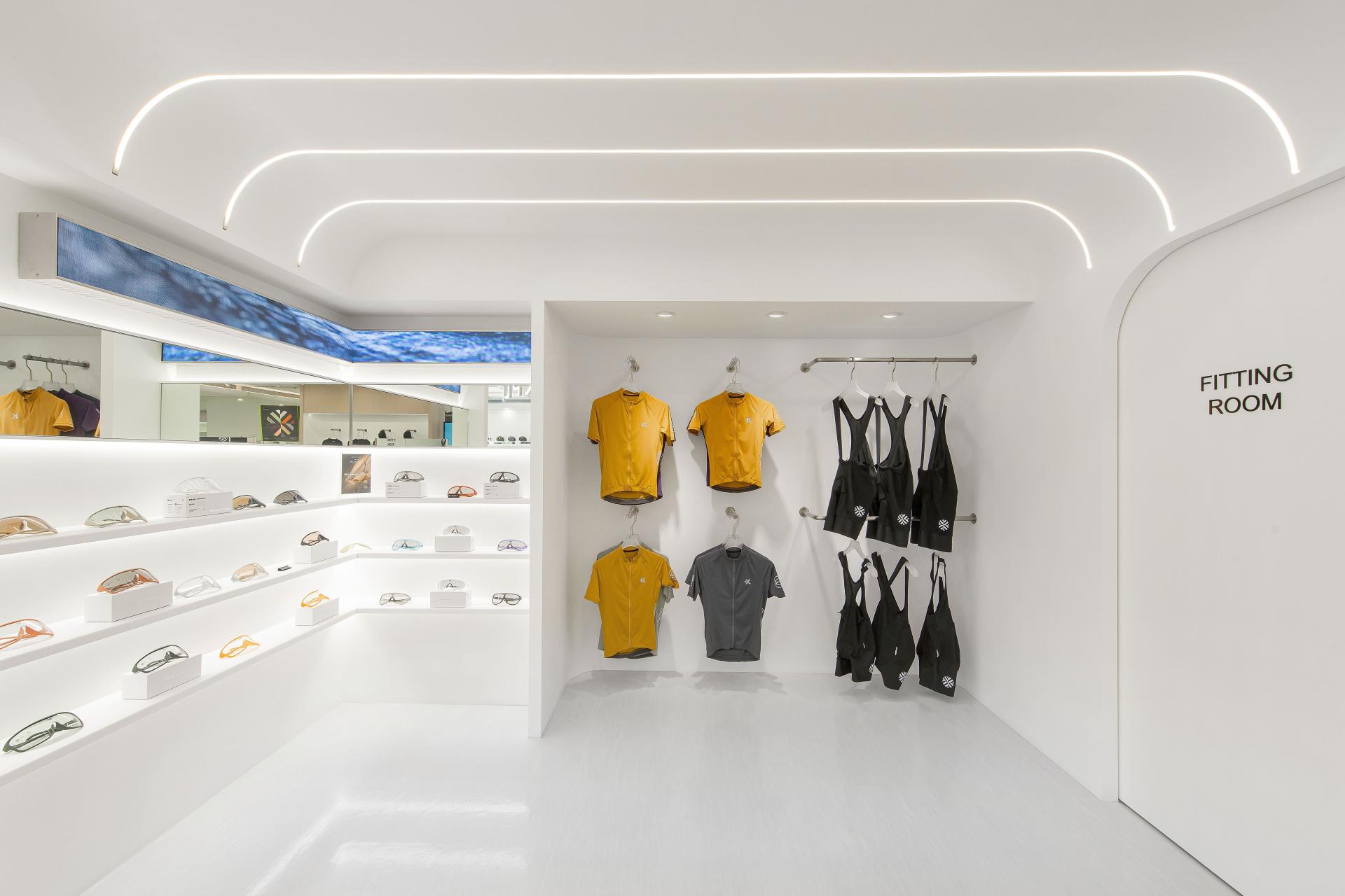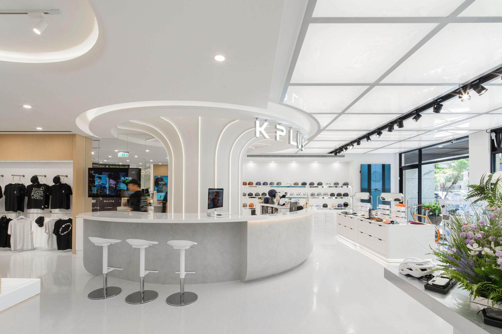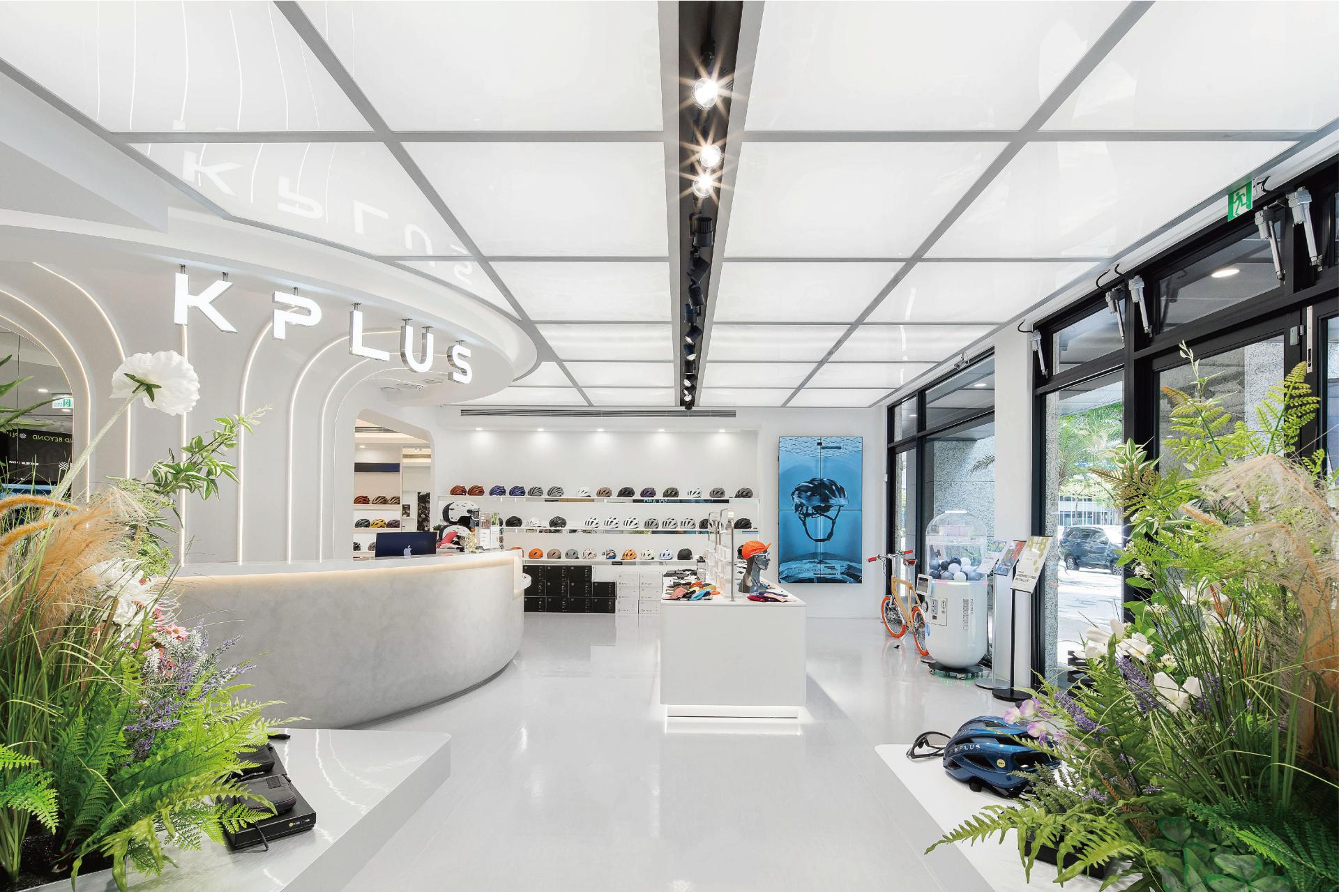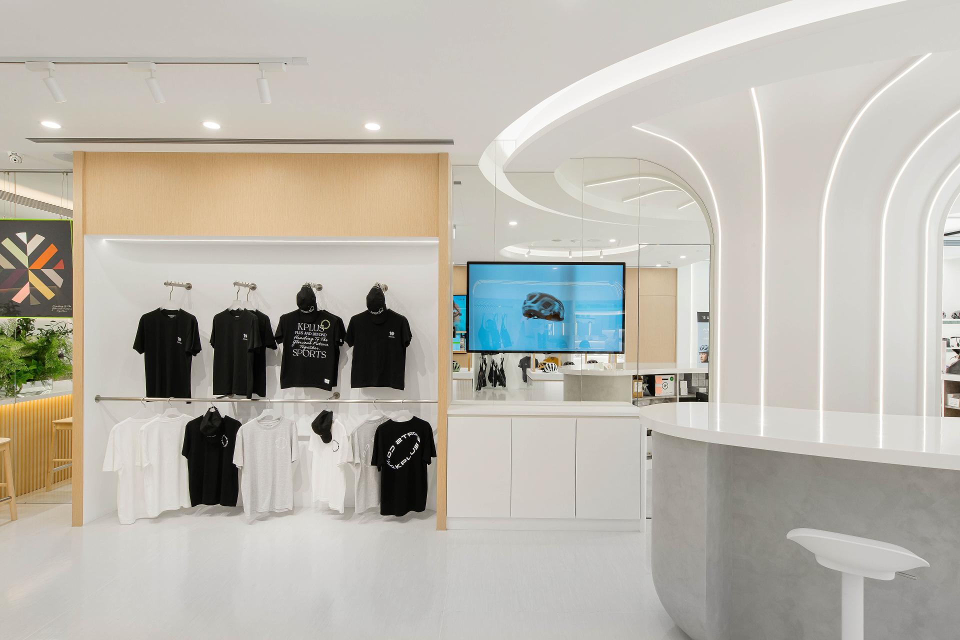 This is a retail store centered on bicycle helmets, showcasing unparalleled technological aesthetics through a modern and minimalist design language. The bright white color scheme sets a clean and transparent tone, creating an atmosphere that feels like stepping into the future. Large glass windows bring in natural light, highlighting the unique textures and details of each product in the interplay of light and shadow.