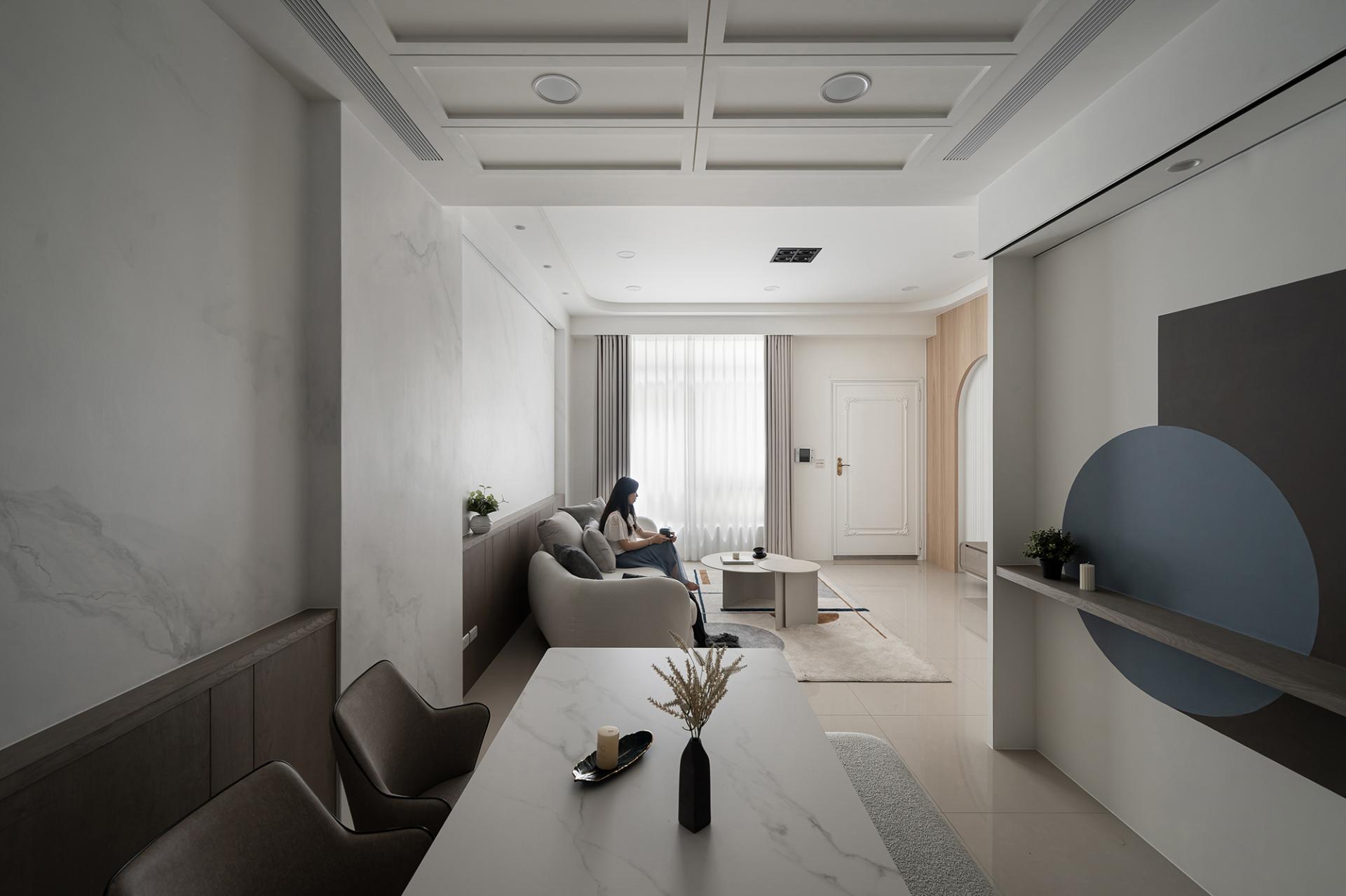 In the thoughtfully designed public space, graceful curved lines elegantly soften the sharp edges of structural elements, allowing light and shadow to flow freely along the beautifully arc-shaped textures. This interplay creates a light and tranquil visual rhythm that invites relaxation and contemplation. At first glance, the ceiling unfolds like a prelude to the overall scene, showcasing its intricate multi-layered lines that captivate the eye. Moreover, the curved design not only reflects the homeowner's aesthetic preferences but also effectively accommodates the practical needs of concealed air conditioning units. This foresight ensures that maintenance, future replacements, and disassembly can be carried out smoothly, thus achieving a harmonious balance between beauty and functionality.