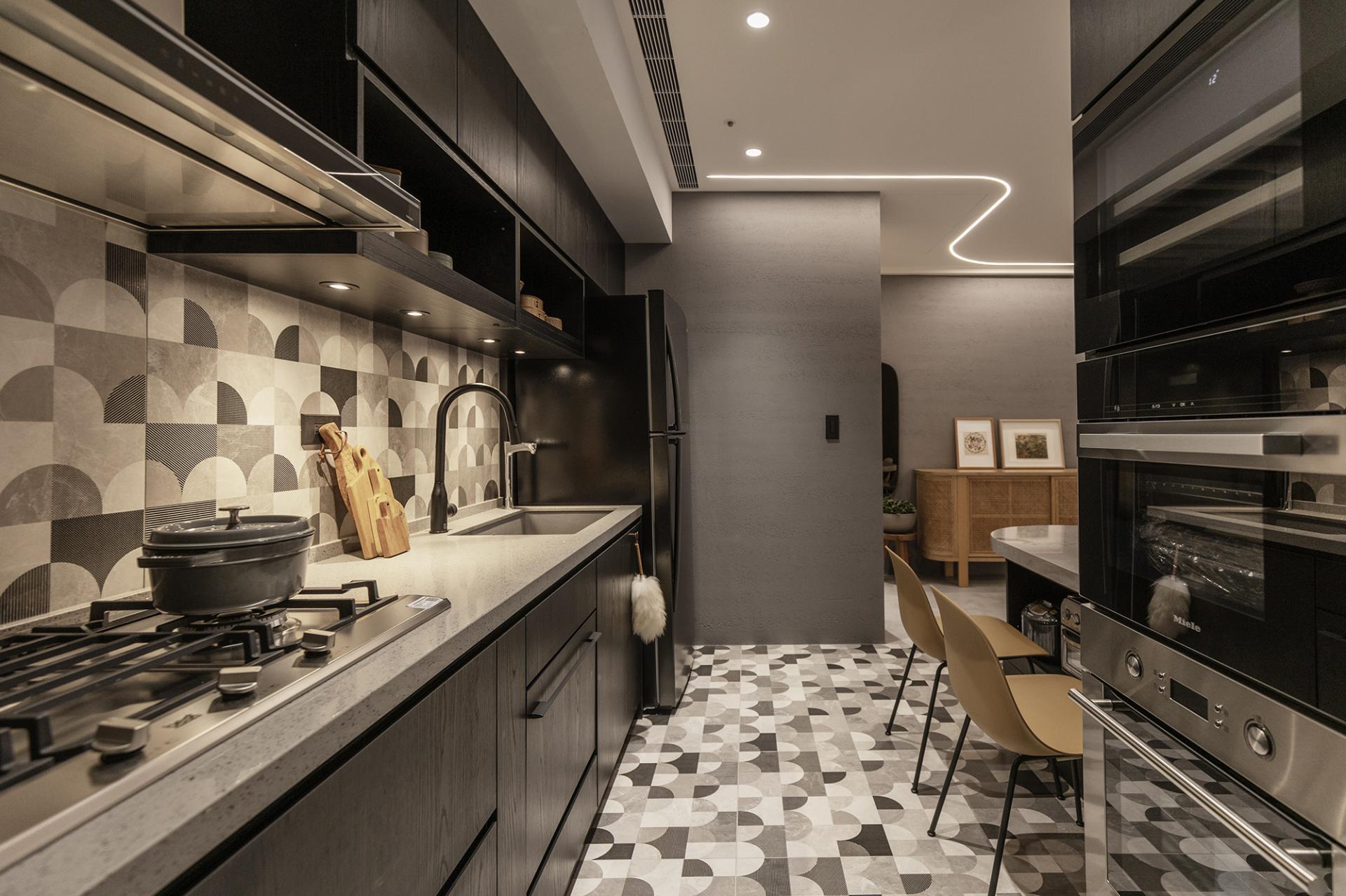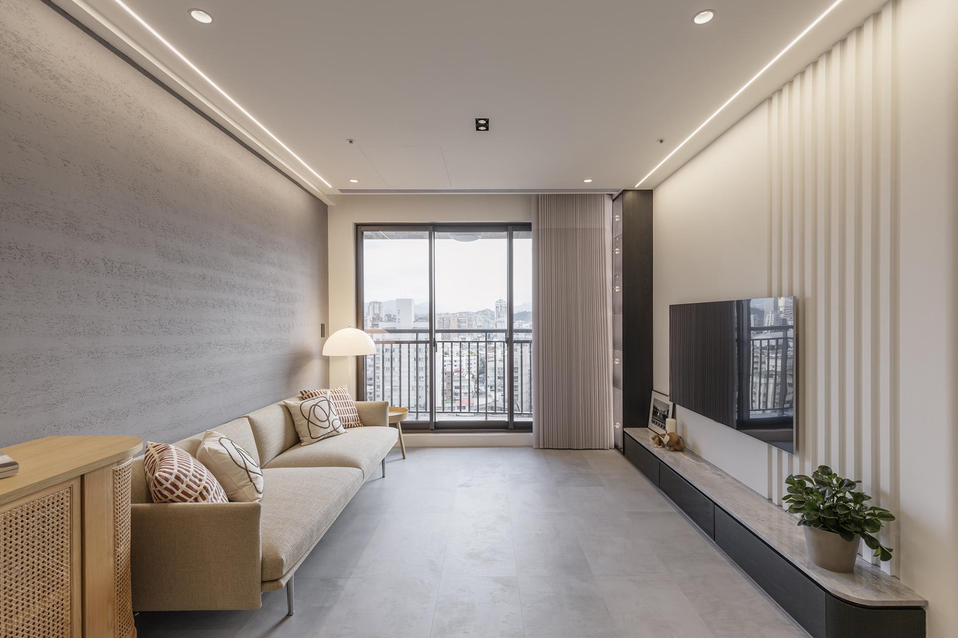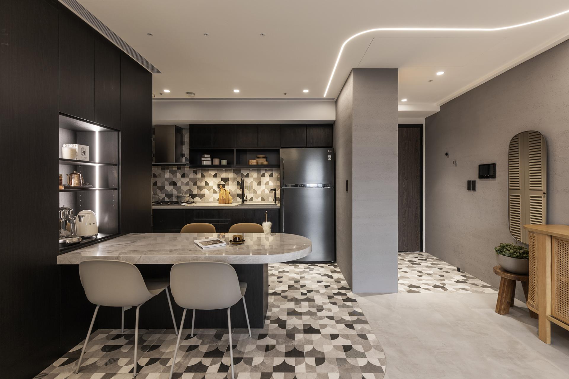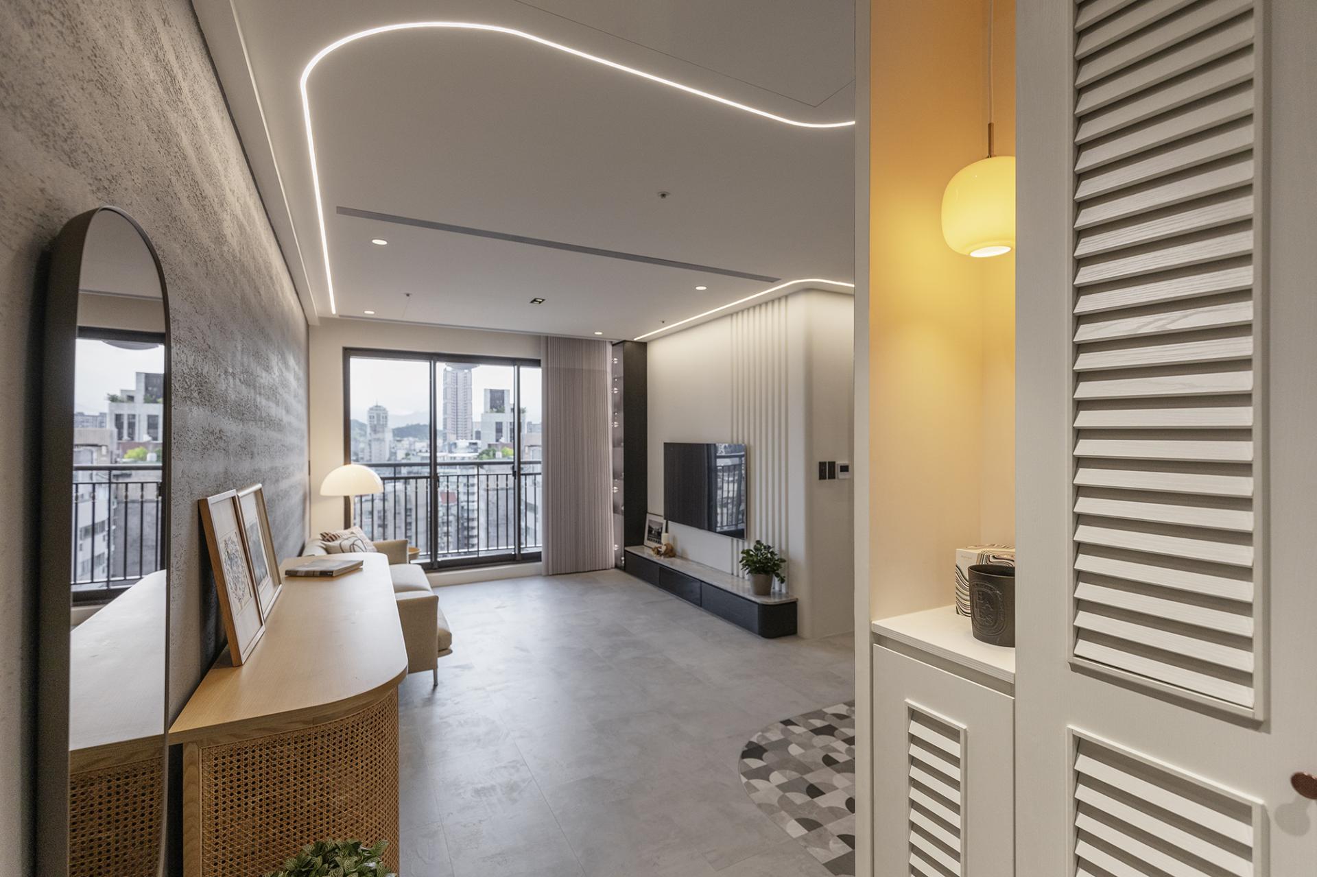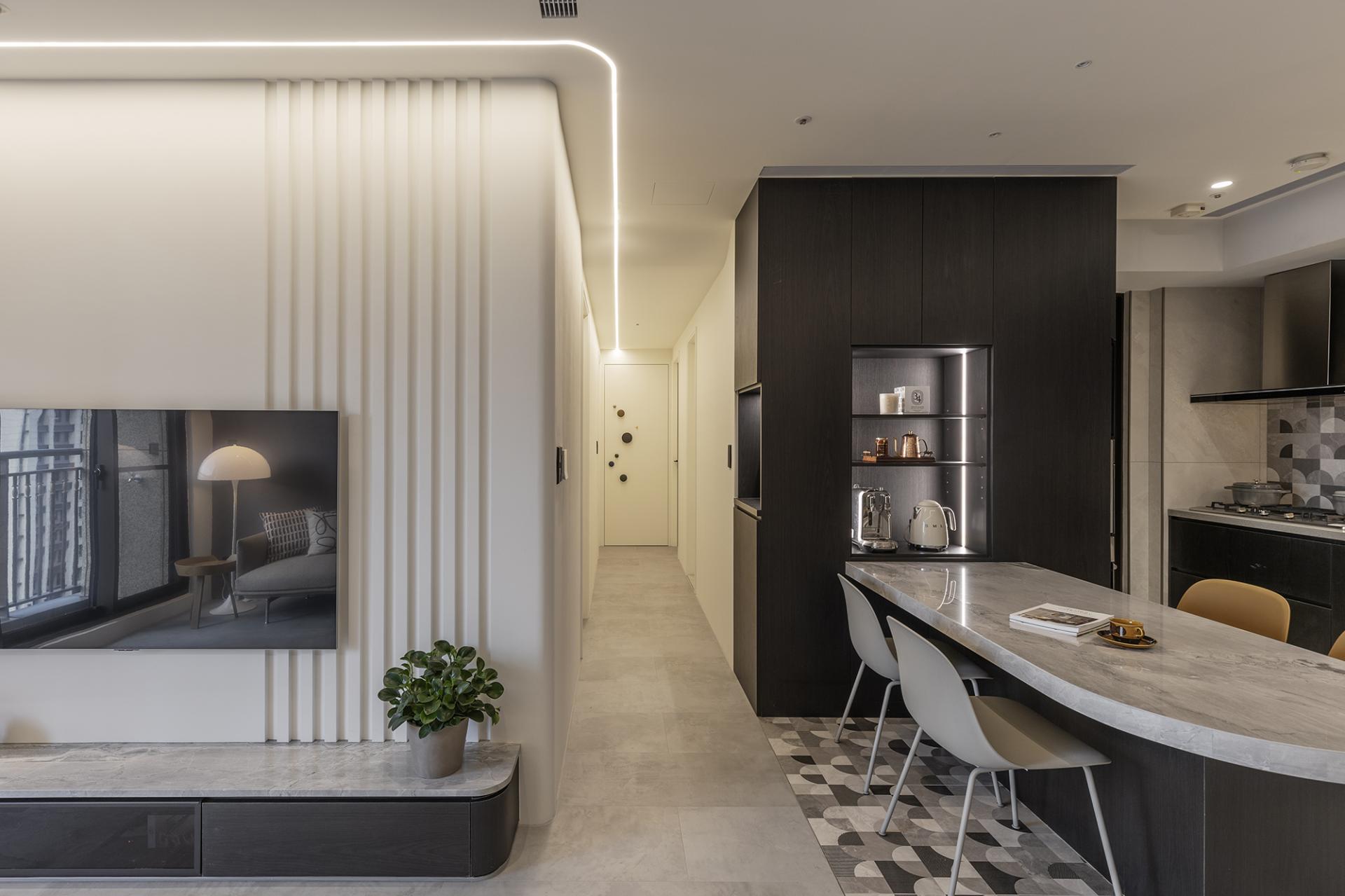 The entryway is elegantly adorned with gray-scale mosaic tiles that define the entrance space, flowing seamlessly into both the dining and kitchen areas. This design choice creates a striking contrast against the light-colored floor tiles of the living room, enhancing the overall aesthetic. As you move through the space, the white louvered cabinets and warm pendant lights contribute to a sense of warmth and homecoming. In the living room, the TV wall captivates attention with a rhythmic interplay of three-dimensional grilles and luxurious marble countertops, serving as a focal point that draws the eye. Meanwhile, the backdrop wall for the sofa introduces a rich depth with its deep gray tones, anchoring the entire seating area. Moreover, the curved corner of the TV wall gracefully extends into the hallway, where paneled doors effortlessly blend into the walls. This thoughtful design choice creates a cohesive and fluid flow throughout the home, making every transition feel both natural and inviting.