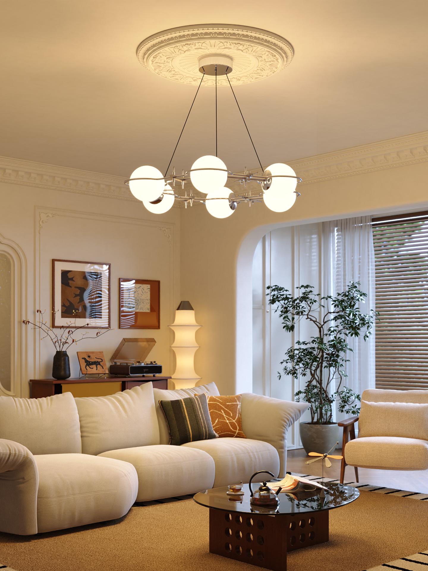 The lamp’s soul is rooted in the deconstruction of industrial aesthetics, “glass × optic axis.” The rigid aviation-grade aluminum, crafted through precision CNC milling and 24 electroplating processes, forms the floating, rational “ring”; each high-transparency glass sphere, blown by skilled artisans, becomes the warm, emotional “star.” When the lamp is turned on, the tough metal ring and the soft luminous glass spheres achieve a delicate balance, blending the boldness of industrial design with the romance of a cosmic star ring, making the lamp a striking visual centerpiece in any room.
