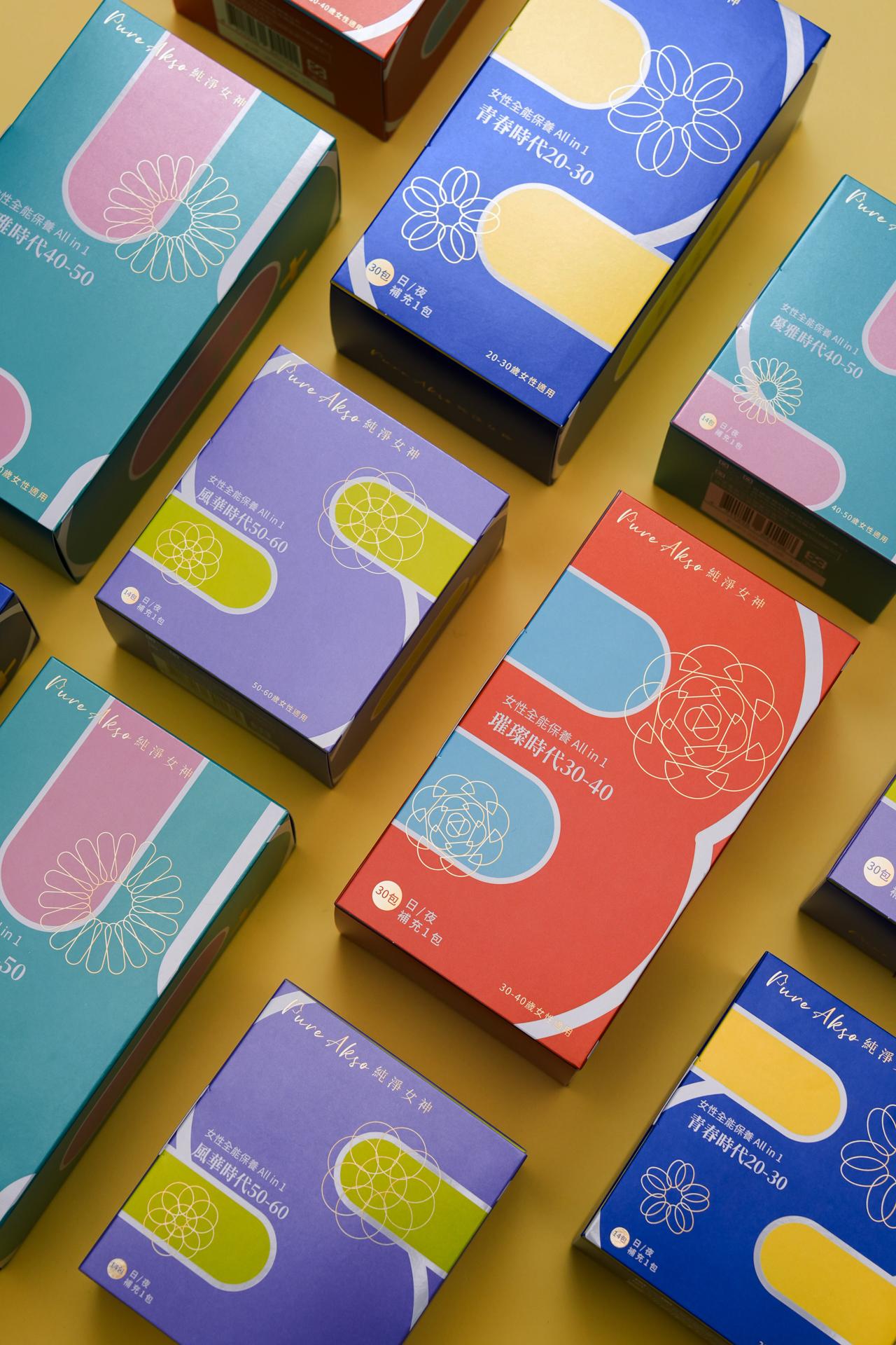 Vibrant color palettes paired with minimal floral patterns visually communicate specific nutrition, presenting tailored benefits for specific age groups: For women in their 20s, yellow contrasted with indigo supports digestion to provide a plumping complexion. In their 30s, the pairing of orange and egg blue refers to a delightful supplement to boost energy and to keep mental clarity at the same time. Beyond the age of 40s, calm turquoise and blush pink reflect the efficacy of stress relief and metabolic balance. For women in their 50s and beyond, purple matching with yellowish lime color resembles the vision of ‘returning to the youth,’ symbolizing the graceful and dignified camellias.