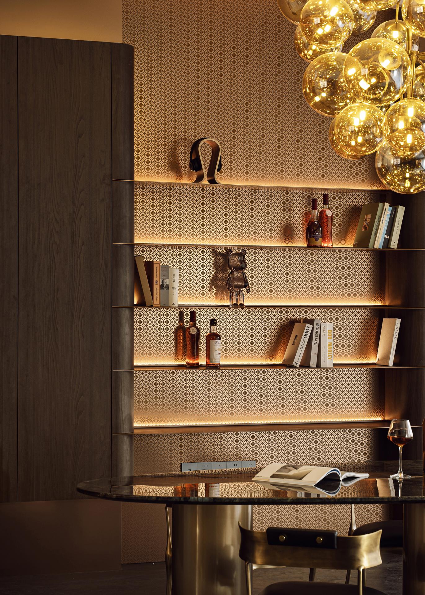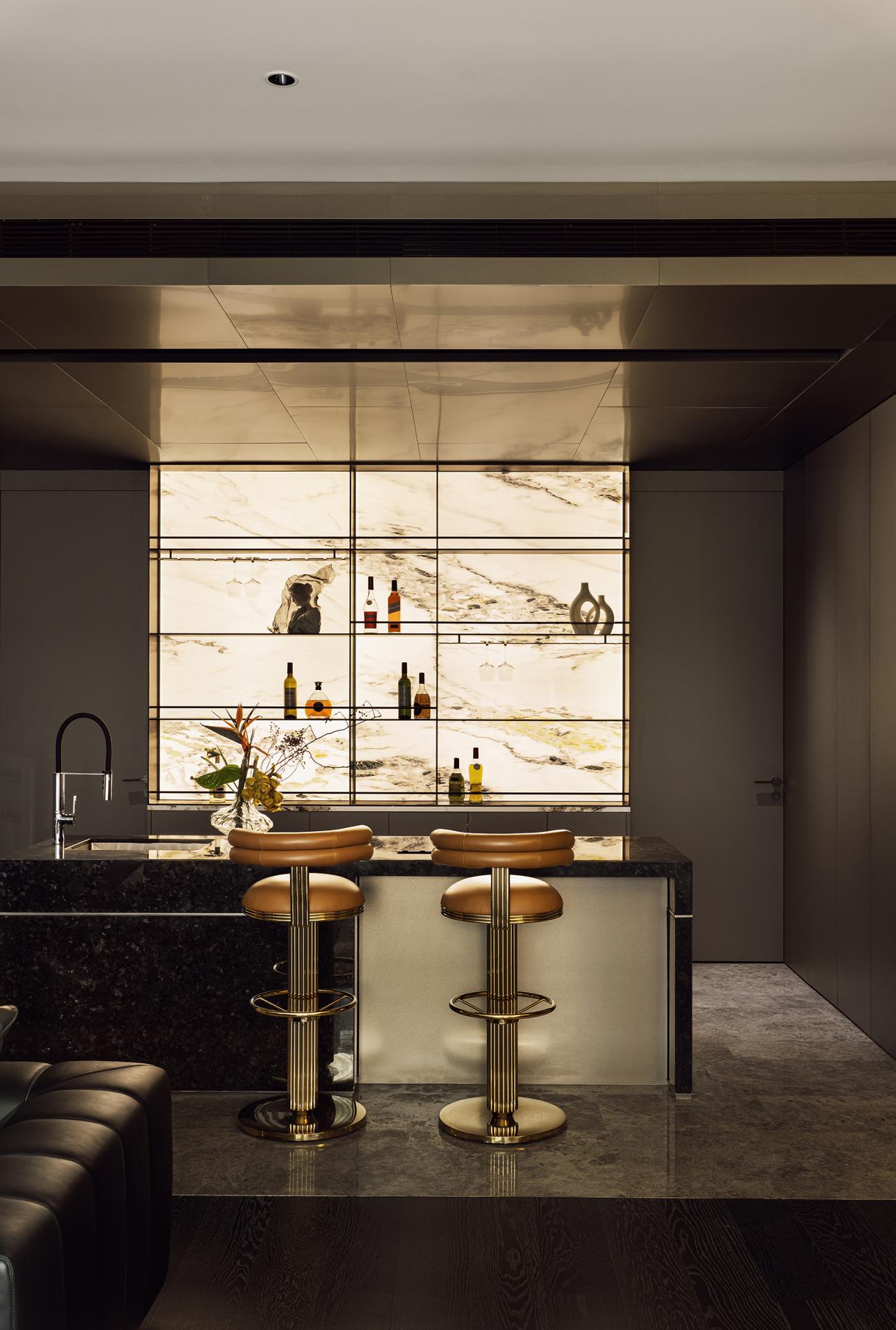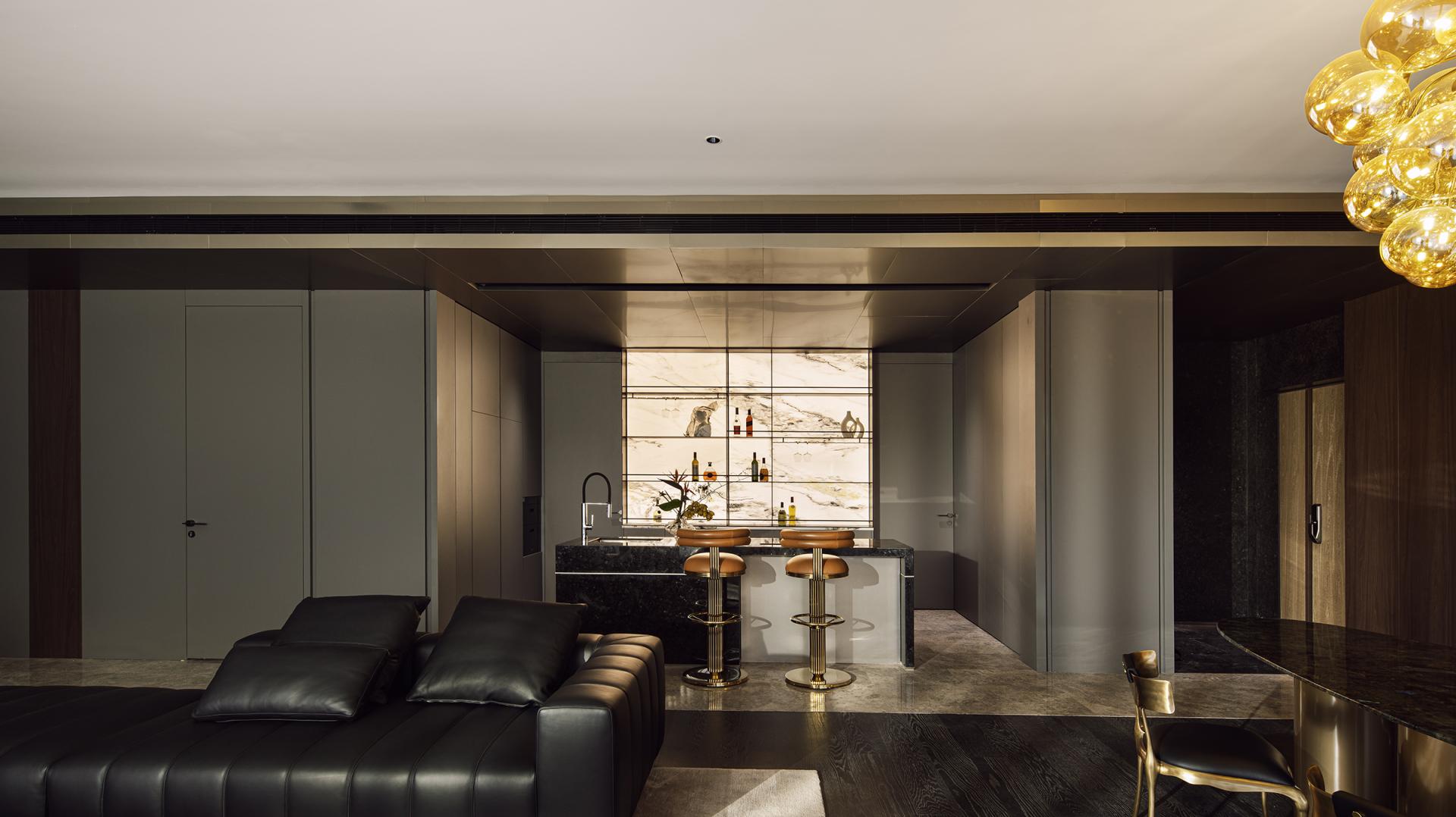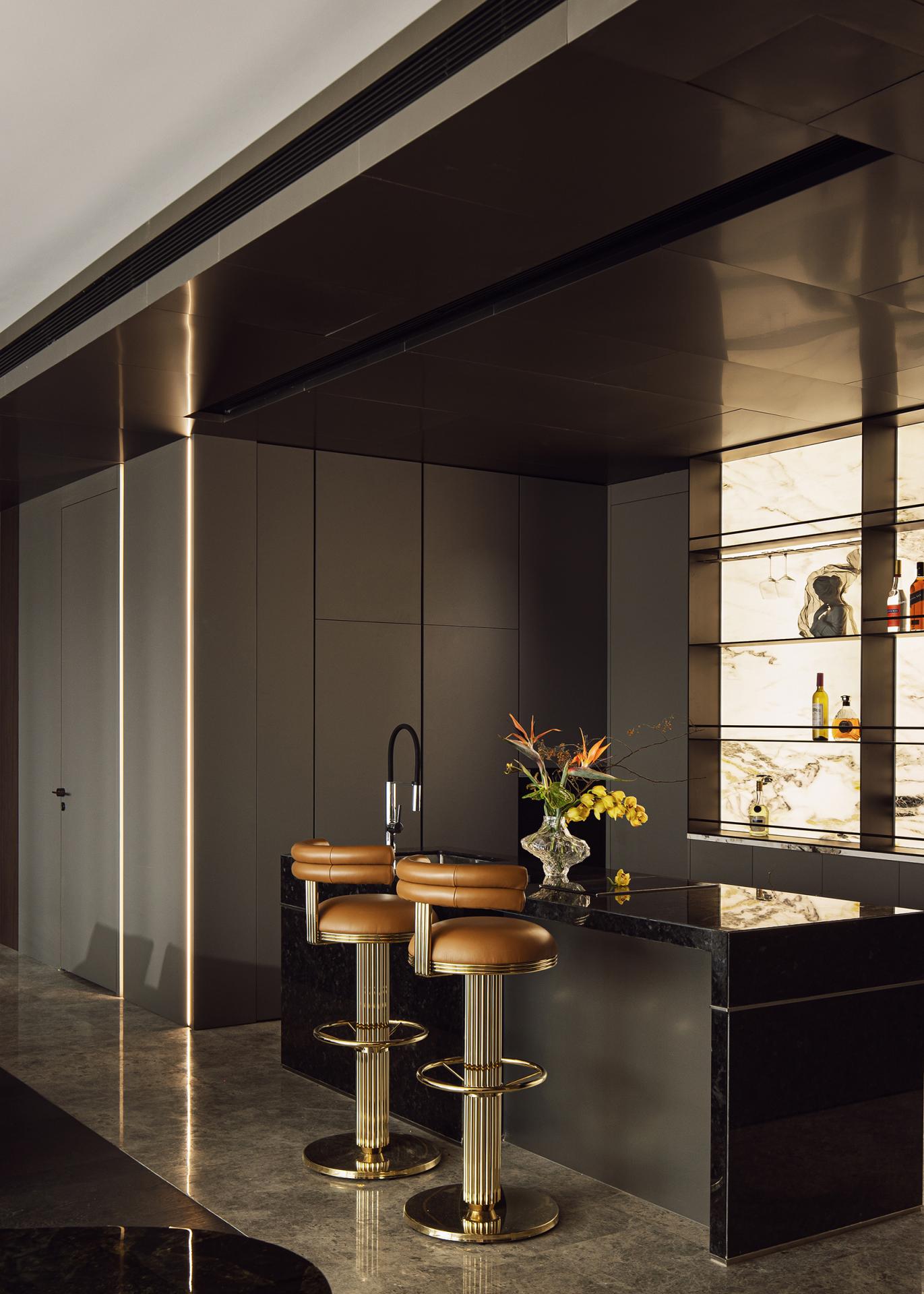 The open-plan kitchen and dining area maintains both functional clarity and visual continuity, encouraging interaction and warmth in everyday life. A careful balance of stone, leather, and metal details brings rhythm and texture through the contrast of warm and cool materials, while restrained color transitions express a composed yet rich spatial language.