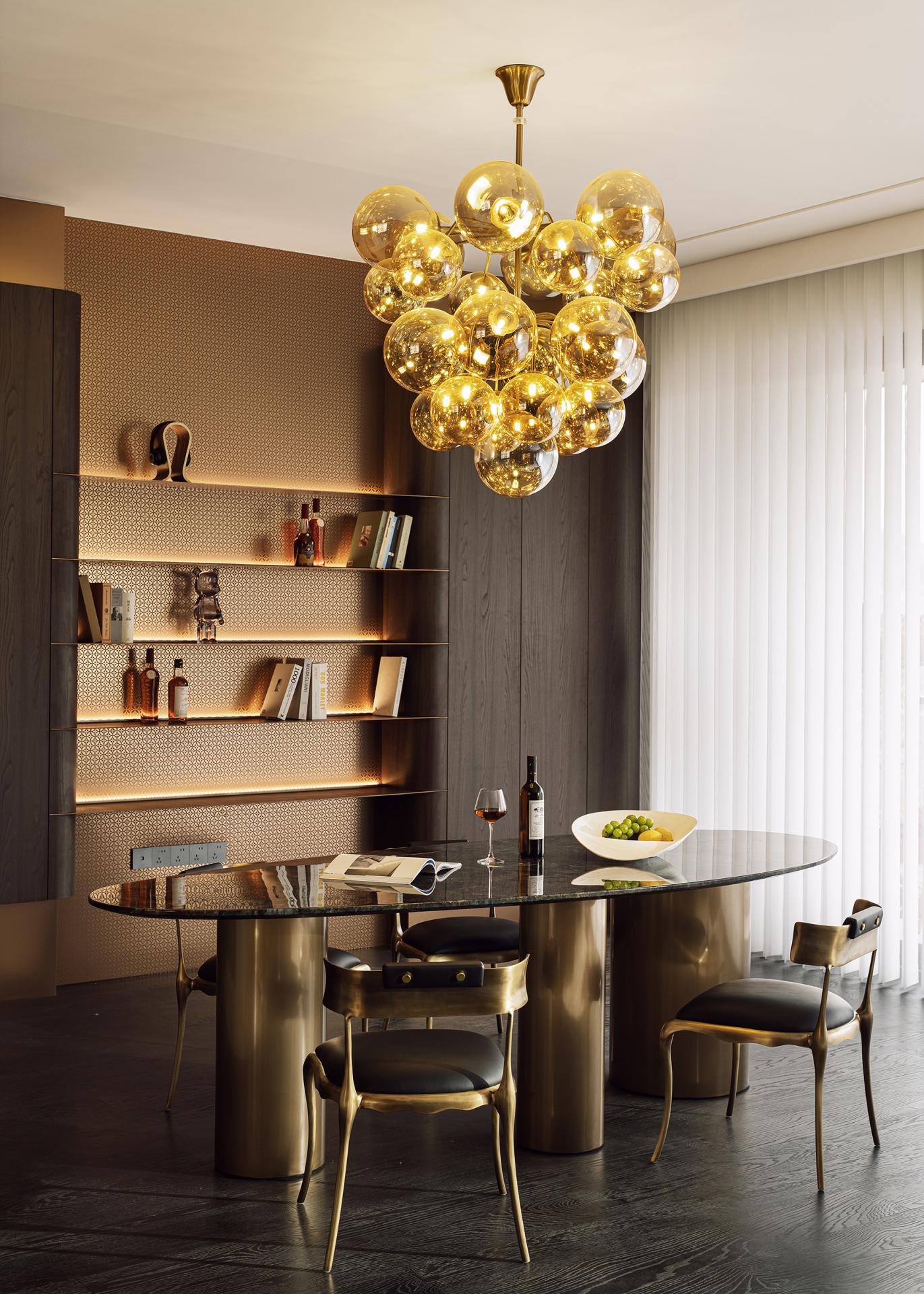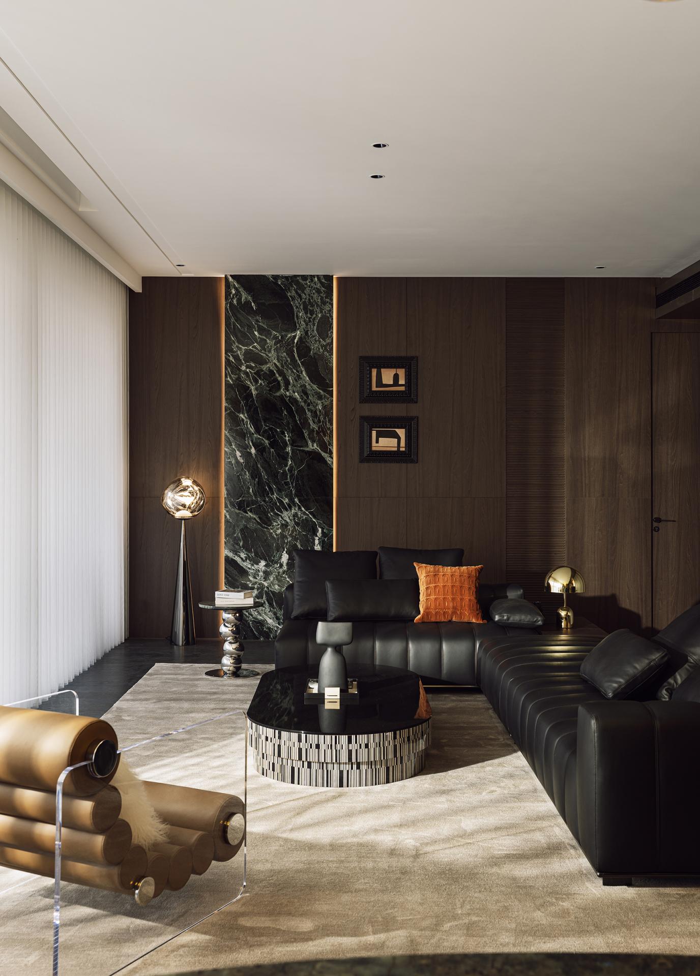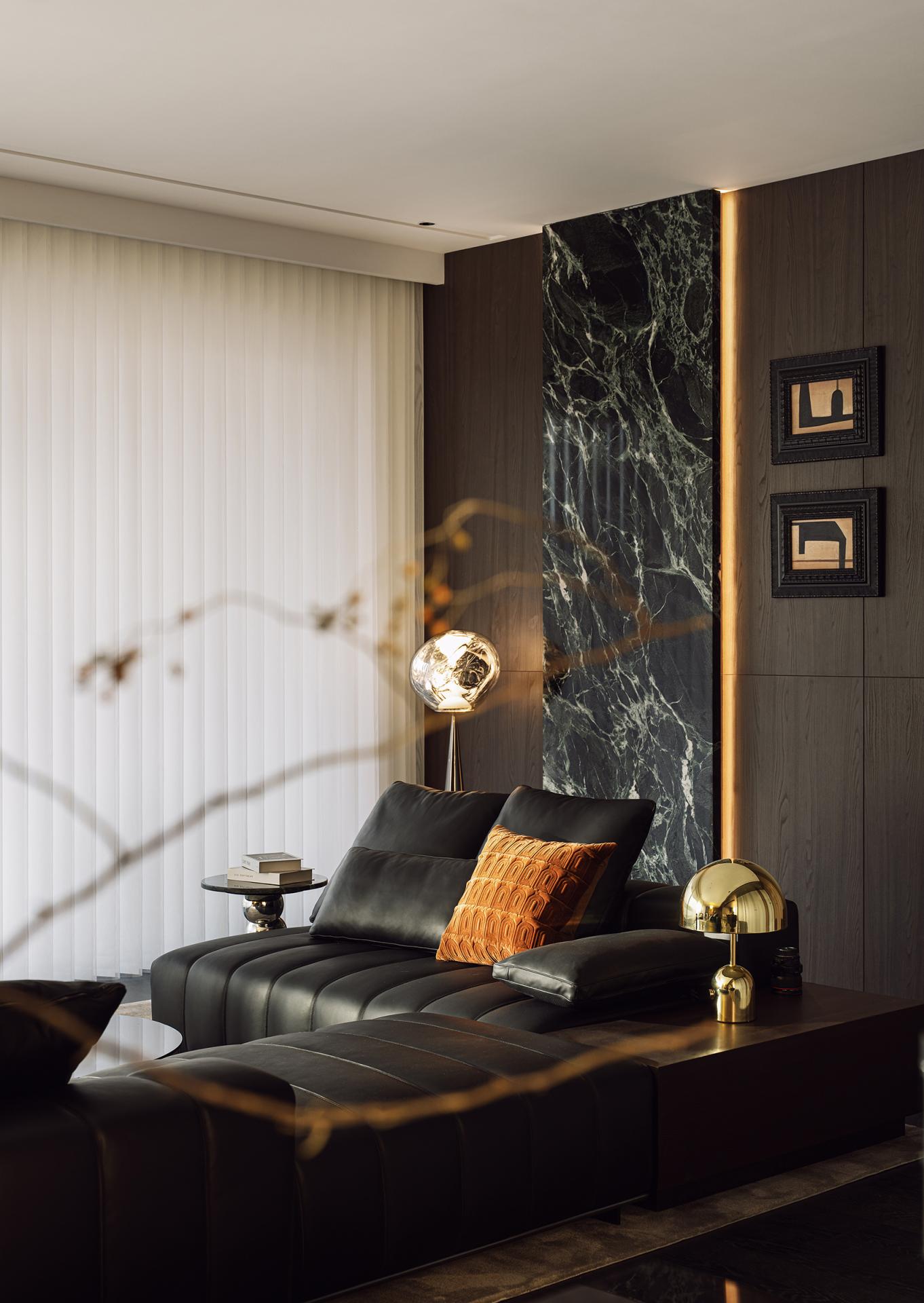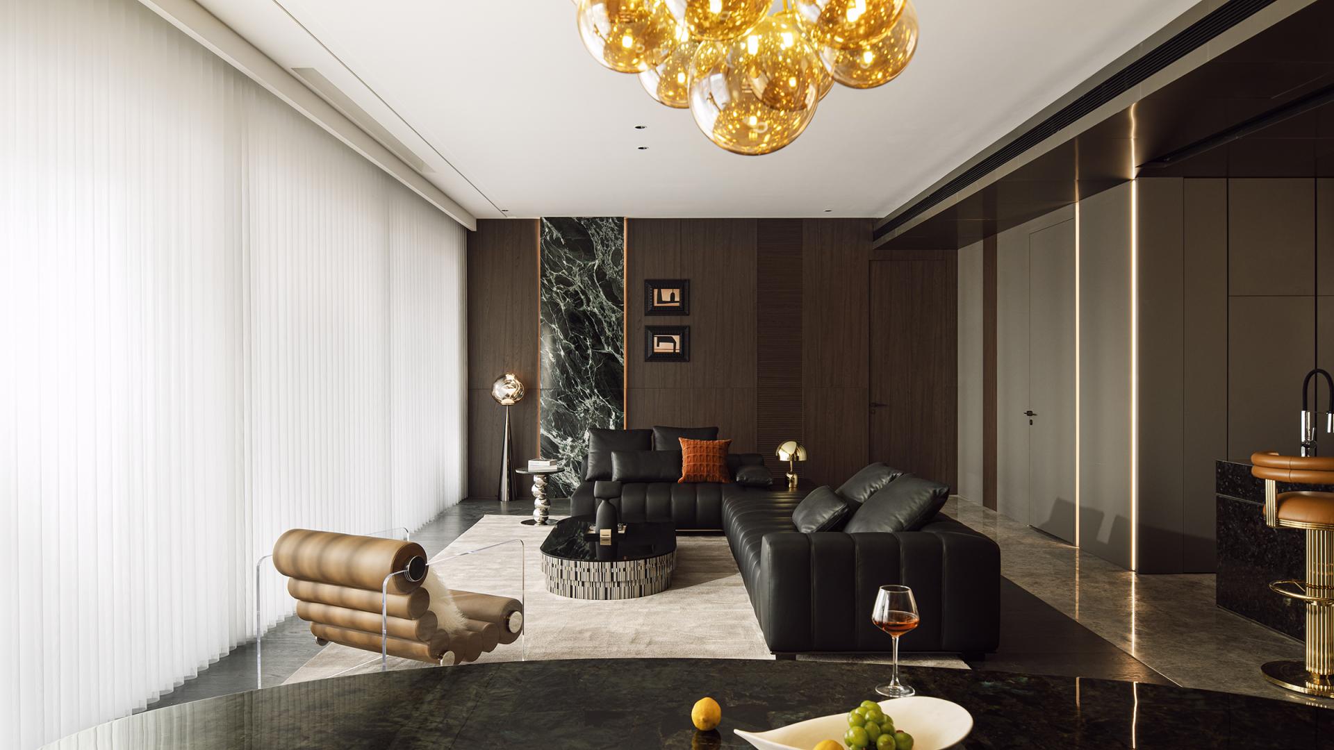 The living and dining area, organized as a large horizontal hall, becomes the visual and social core of the home. By reorienting the layout, the best views and daylight are reserved for the main living space, while integrated storage is subtly embedded into the overall design. Instead of a conventional TV wall, a projection system is adopted, allowing the space to remain open, fluid, and better aligned with the owners’ lifestyle. Neutral tones form the base palette, accented by deep green and champagne gold, creating a calm yet refined atmosphere. Floor-to-ceiling windows introduce abundant natural light, visually extending the space in both horizontal and vertical directions.