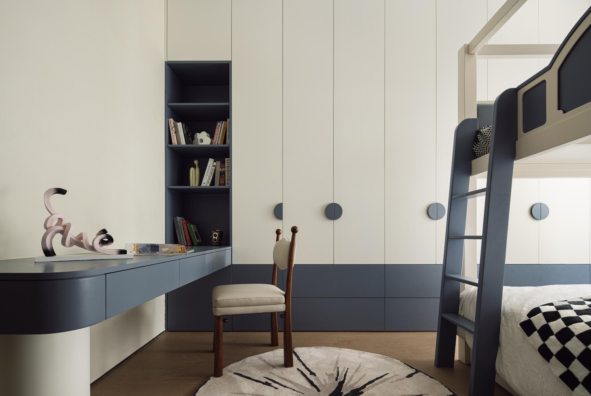 The master bedroom is designed as a private retreat, defined by soft materials, gentle lighting, and minimal decoration, creating a quiet and elegant resting environment. Children’s rooms are planned to evolve with their growth. The daughter’s room uses a bright and playful palette with integrated study and storage by the window. The boy’s room, converted from the former study, adopts green tones and layered textures to create a natural and inspiring atmosphere. An additional children’s room with bunk beds maximizes activity space and storage, ensuring flexibility for future needs.