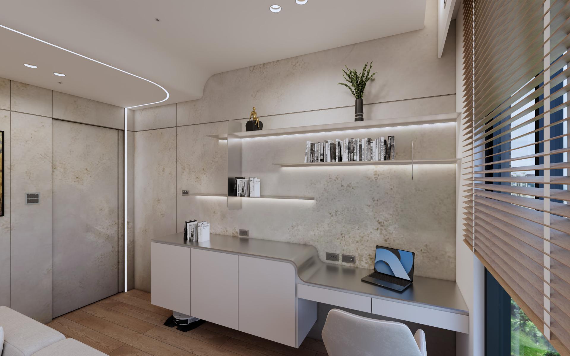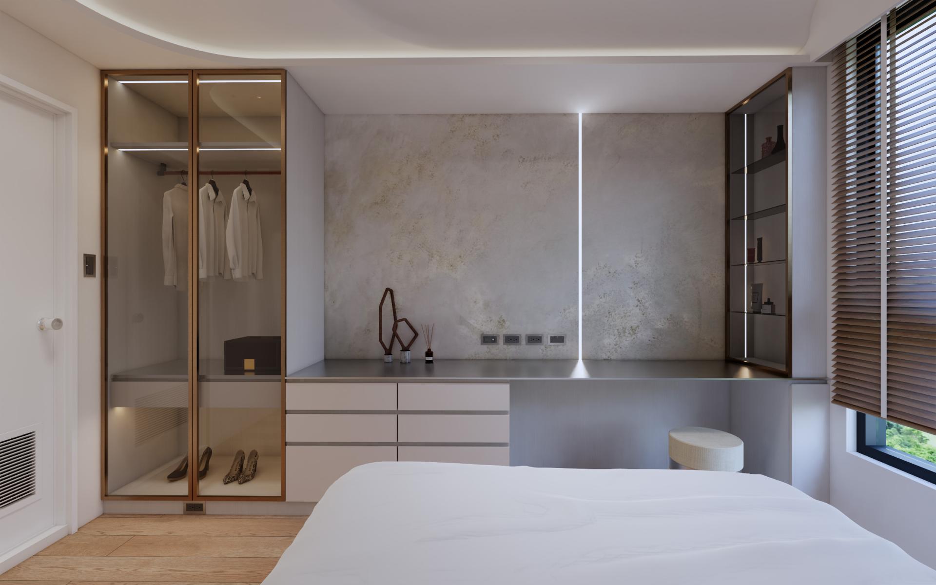 The most distinctive feature lies in its bold application of traditional craftsmanship within a contemporary high-rise residence. As Gangshan District remains quietly visible beyond the windows and light shifts across the interior throughout the day, the walls gradually absorb warmth and depth. Unlike conventional modern system cabinetry or lightweight interior finishes, the design introduces centuries-old mortise-and-tenon joinery into a thirteenth-floor residential setting, allowing structural logic itself to become part of the spatial order. The inherent flexibility of mortise-and-tenon construction not only responds to the structural stability required in the high-rise building, but also establishes a restrained yet powerful rhythm where different materials intersect. Within the space, the hand-applied textures of Italian plaster, the structural expression of joinery nodes, and the raw qualities of metal and wood together compose a low-volume aesthetic.